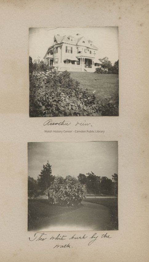 Photo album c 1898-1899, B&W photos, 3.3" square, 95 pages, two images per page, mounted on heavy cardboard pages. The Gookin cottage on Lake Megunticook and presumably the Gookins and friends are the subjects. Mary Isabel Cleveland Gookin is likely the photographer.