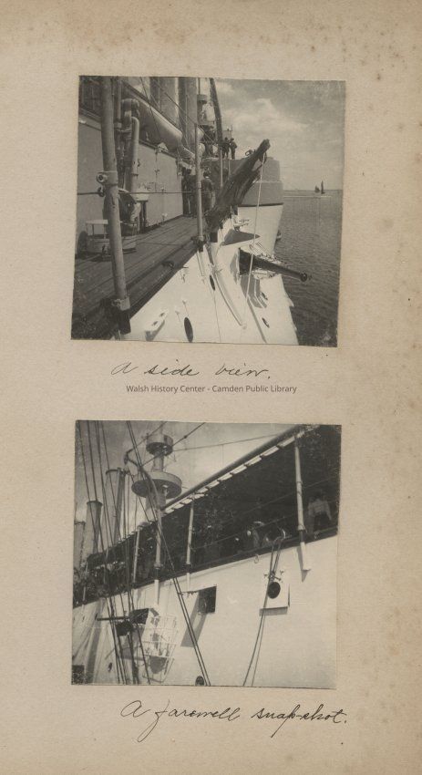 Side view of USS Brooklyn battleship built in Philadephia in 1893-1896 and commissioned in 1896; second photo shows men and women on the deck of the USS Brooklyn