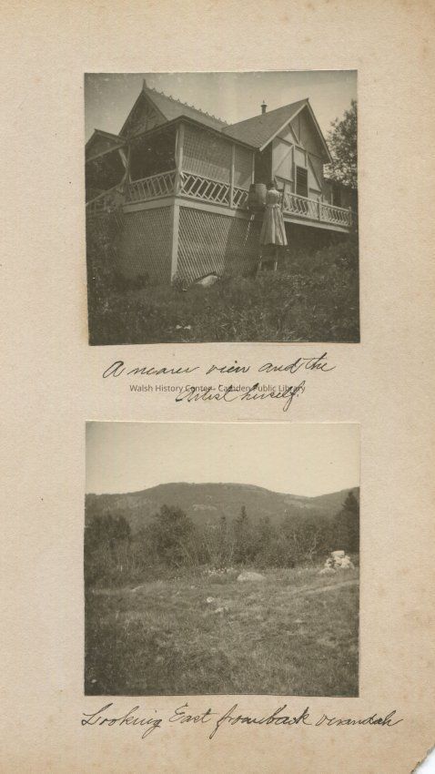 Photo album c 1898-1899, B&W photos, 3.3" square, 95 pages, two images per page, mounted on heavy cardboard pages. The Gookin cottage on Lake Megunticook and presumably the Gookins and friends are the subjects. Mary Isabel Cleveland Gookin is likely the photographer.