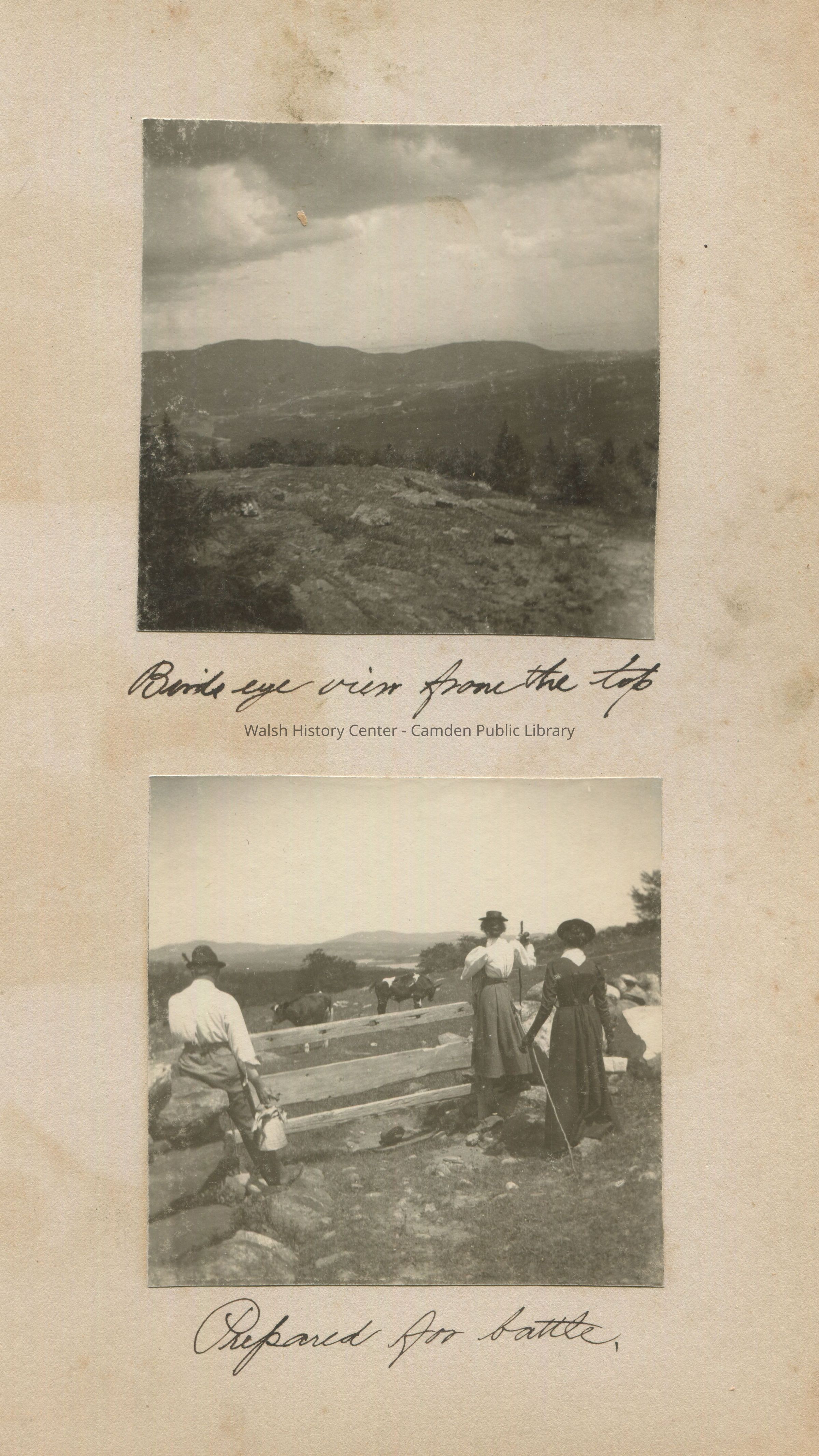 View of a mountain, Camden, Maine; Gookin family - Mary Isabel Cleveland Gookin, mother, Grace Frederick Gookin, daughter, and George Frank Gookin, father staring at two cows from other side of the fence preparing to walk through the cow pasture. The women had walking sticks in hand and George Gookin appears to have a kettle-like item in his hand, identified by Kay White, granddaughter of Grace Gookin.