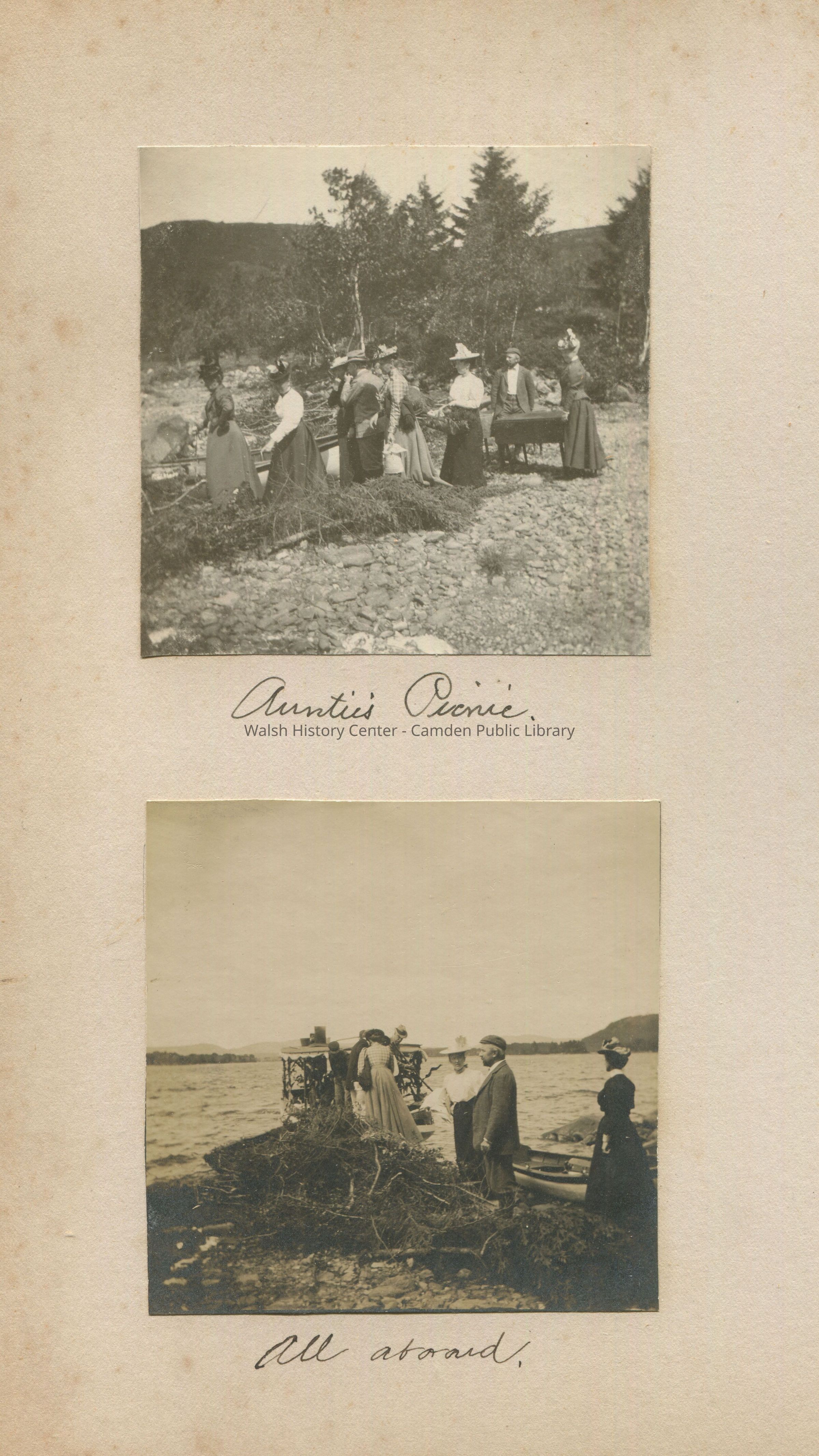 Party of six women and two men walking toward shoreline to a boat in the background. A man and woman with a wagon of pine boughs and pine tree limbs line the path to the boat on the shoreline; picnic party getting on the boat with a canopy. Canopy has elaborate framework. Lots of pine branches are on the shoreline of Megunticook Lake, Camden, Maine