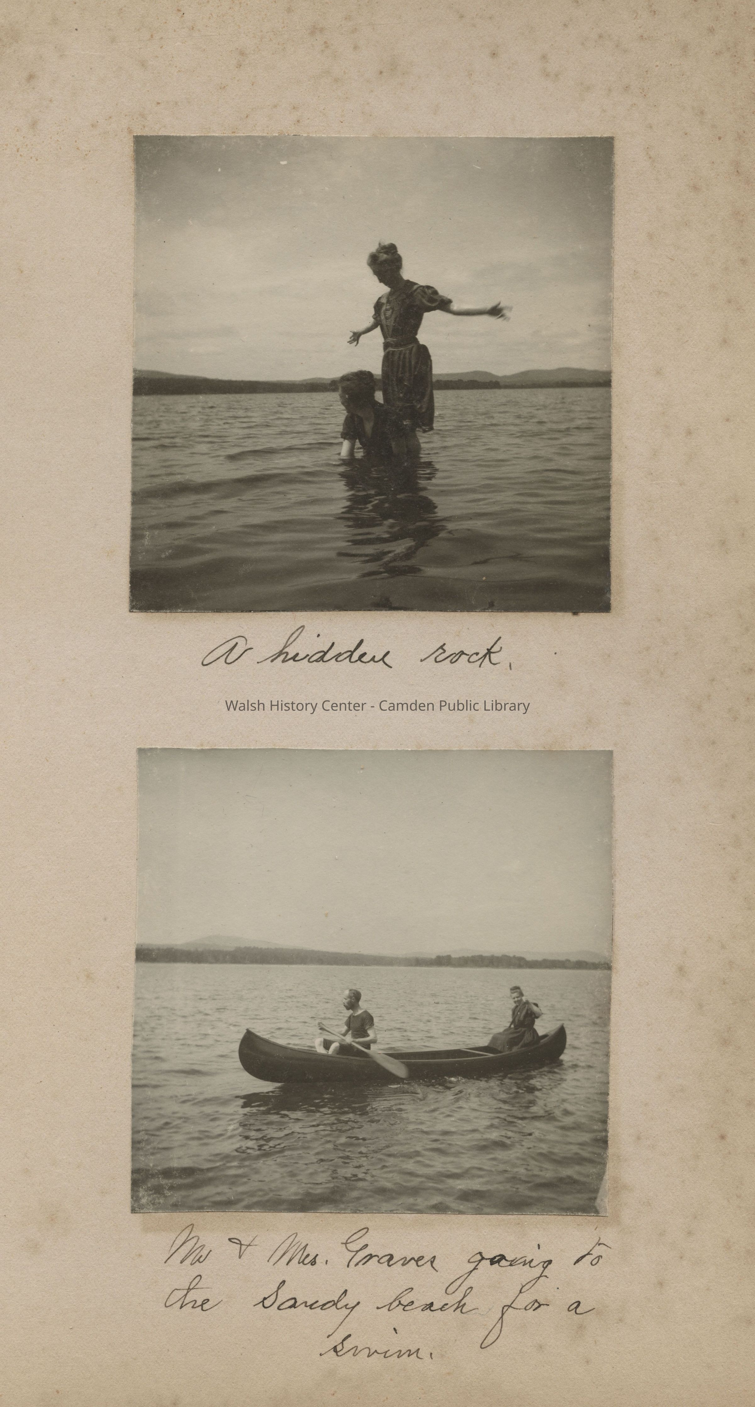 Mr. and Mrs. Graves in Lake Megunticook, Camden, Maine, swimming; Mr. and Mrs. Graves in canoe on Lake Megunticook, Camden, Maine
