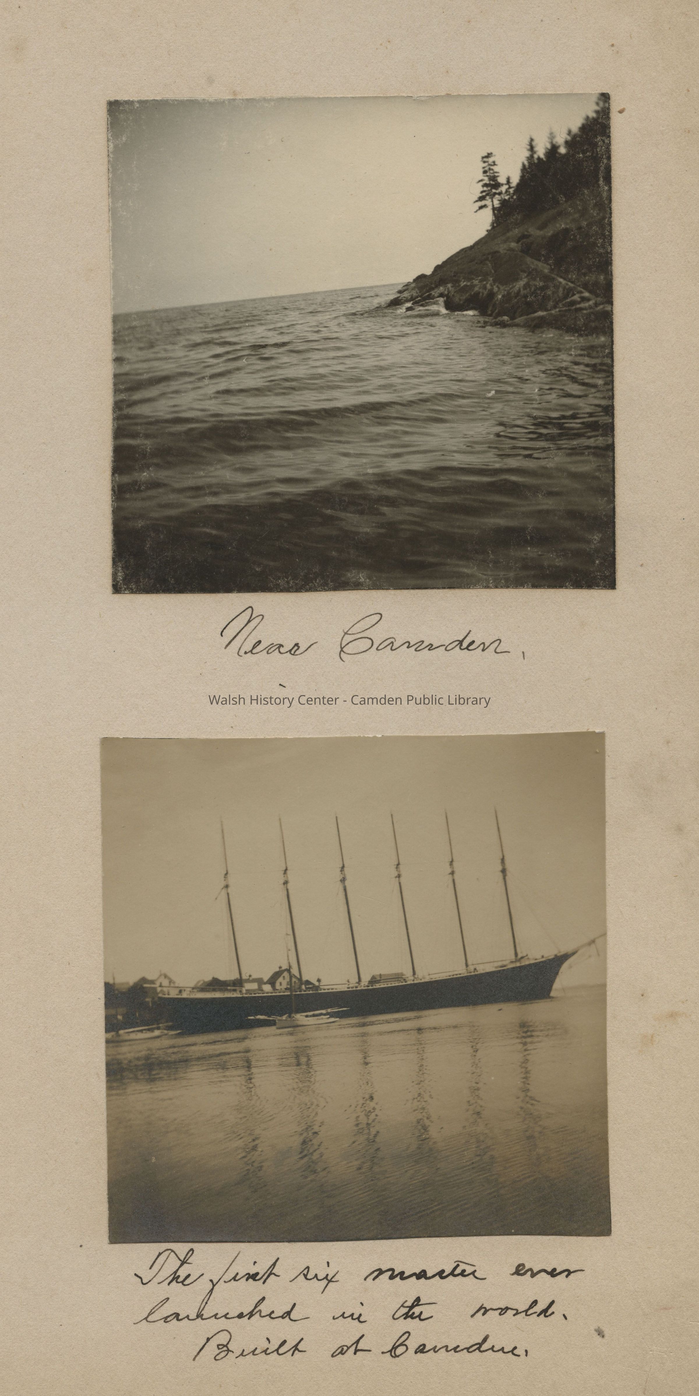 Atlantic coast shoreline near Camden, Maine; The six-masted schooner, George W. Wells, built at the Bean Yard in Camden, Maine. Launched August 14, 1900 at Camden Harbor, Maine.