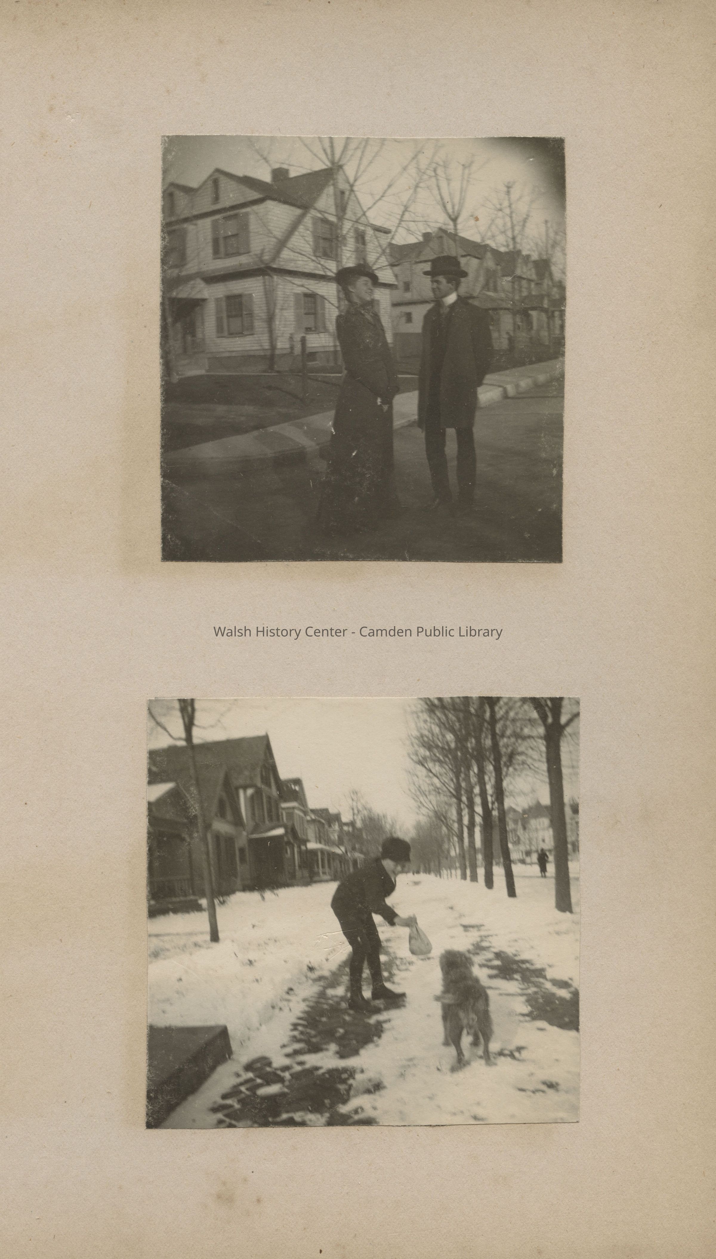 William Karslake and Grace Gookin, standing in front of a row of houses; young boy offering a dog a bag