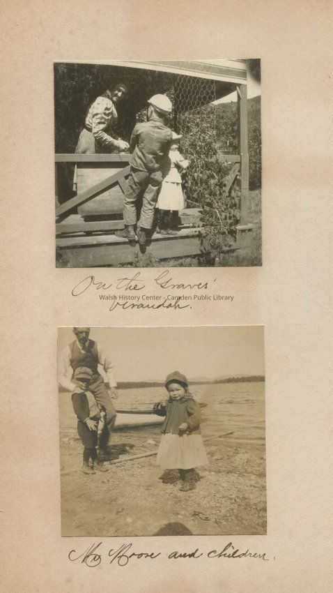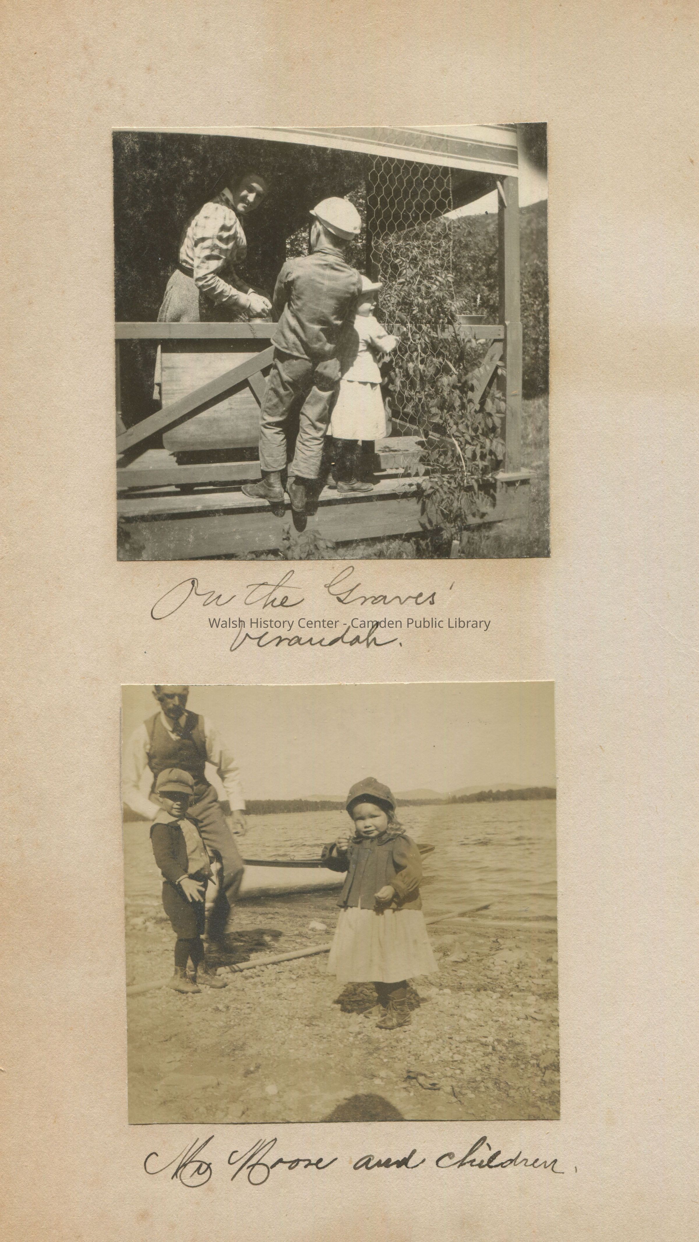 Older woman on the Graves' verandah with a small boy and a small girl standing on the opposite side of the railing on the verandah.; Mr. Moore and presumably his young boy and girl standing on the shoreline with a small rowboat in the background.