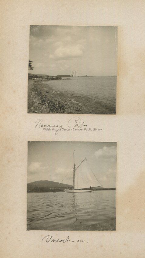 Photo album c 1898-1899, B&W photos, 3.3" square, 95 pages, two images per page, mounted on heavy cardboard pages. The Gookin cottage on Lake Megunticook and presumably the Gookins and friends are the subjects. Mary Isabel Cleveland Gookin is likely the photographer.