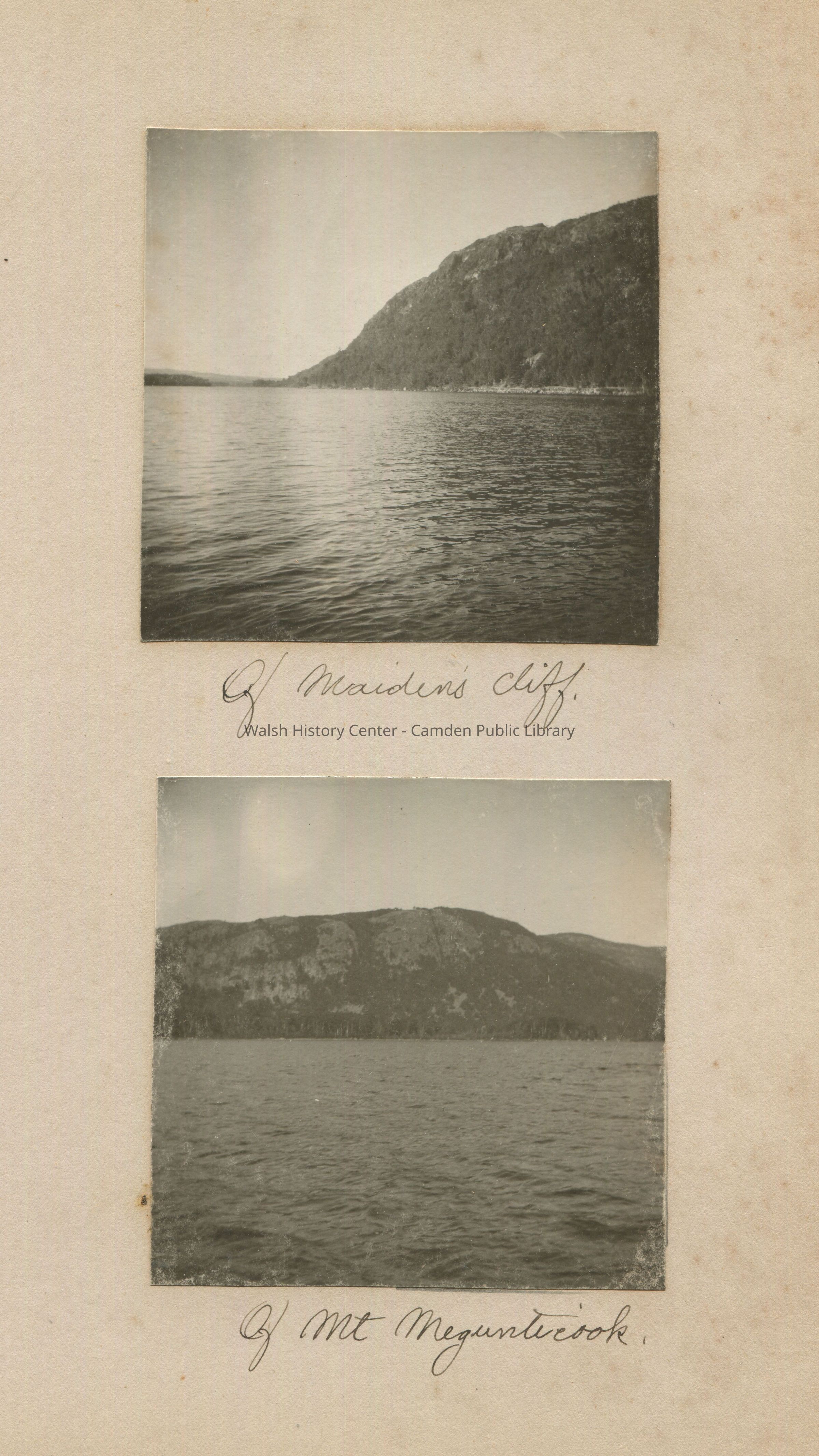 View of Maiden's Cliff, Camden, Maine from Megunticook Lake; View of Mt. Megunticook from Megunticook Lake, Camden, Maine