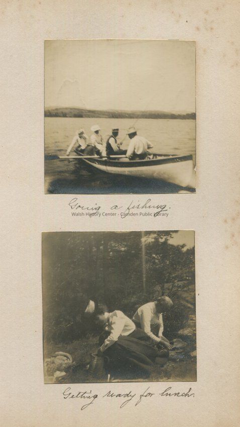 Two men, one is Frank Gookin who is rowing while the second one fishes and two women in a rowboat on Megunticook Lake, Camden, Maine.; Grace Gookin and Frank Gookin getting ready for lunch as identified by Kay White, great granddaughter who also states it was taken on June 25, 1900. Woman is looking into a kettle and the man appears to be working on making a fire.