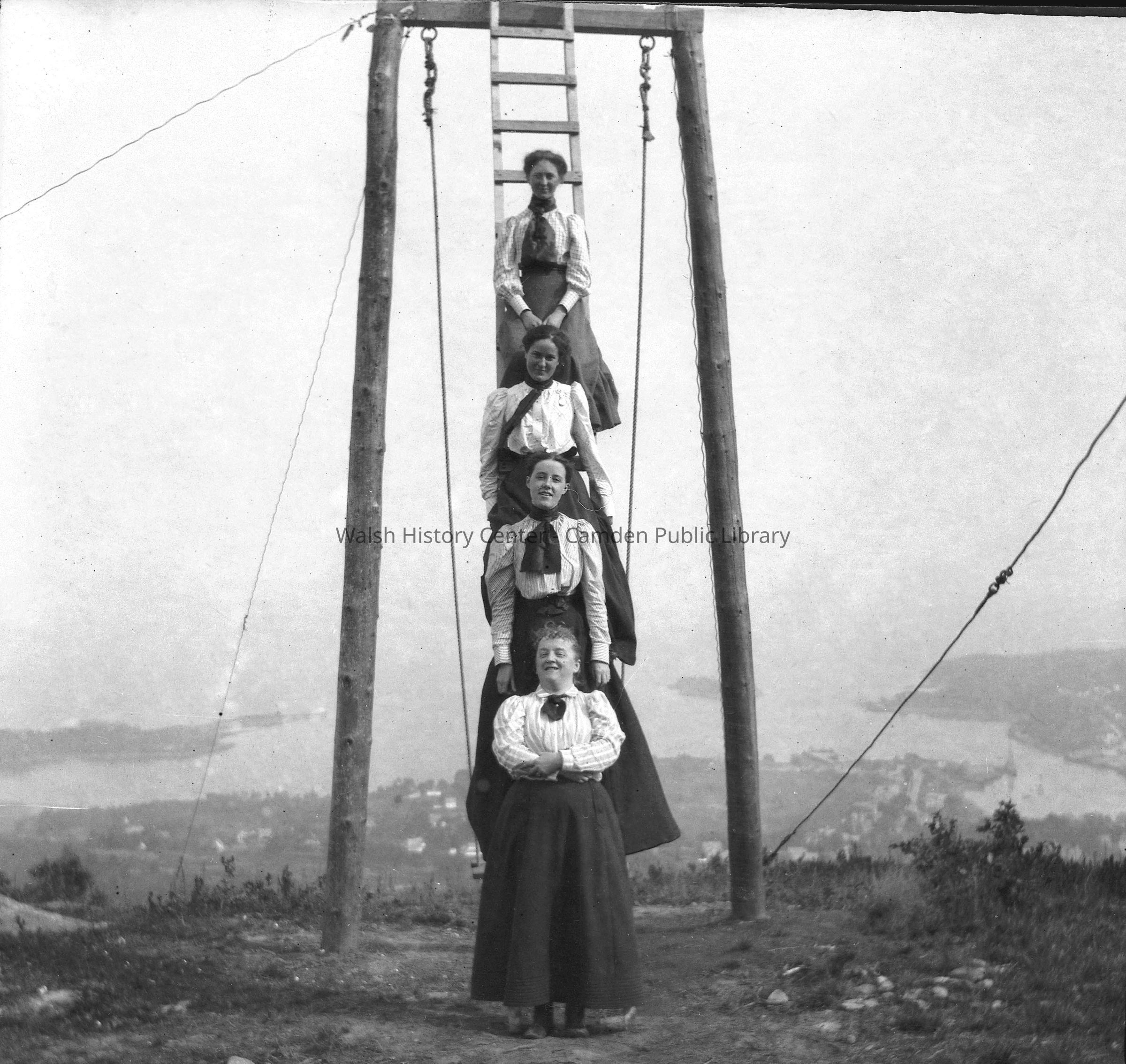 Theresa Babb's sister Grace Parker (top) and friends perched on the swing at the Summit House on top of Mt. Battie on August 17, 1898. The Summit House was built by Columbus Buswell in 1897 and in 1899 was purchased by the Mt. Battie Association and renovated the same year. The clubhouse was torn down in 1920.Collection