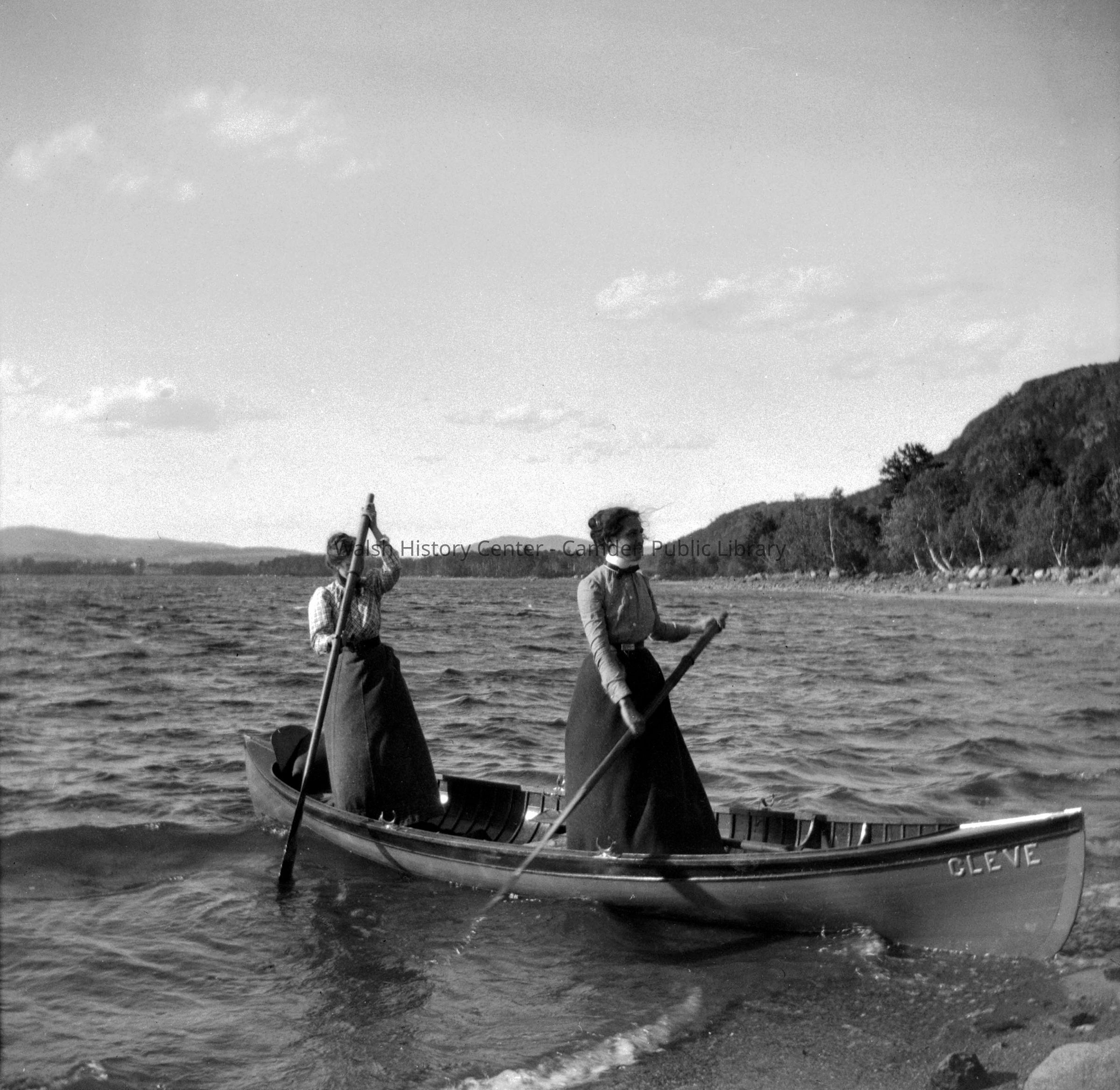 Black and white photograph of Theresa Babb's sister Grace Parker (on left) with her friend Grace G. The women are rowing at Lake City on Megunticook Lake in Camden, Maine.Collection