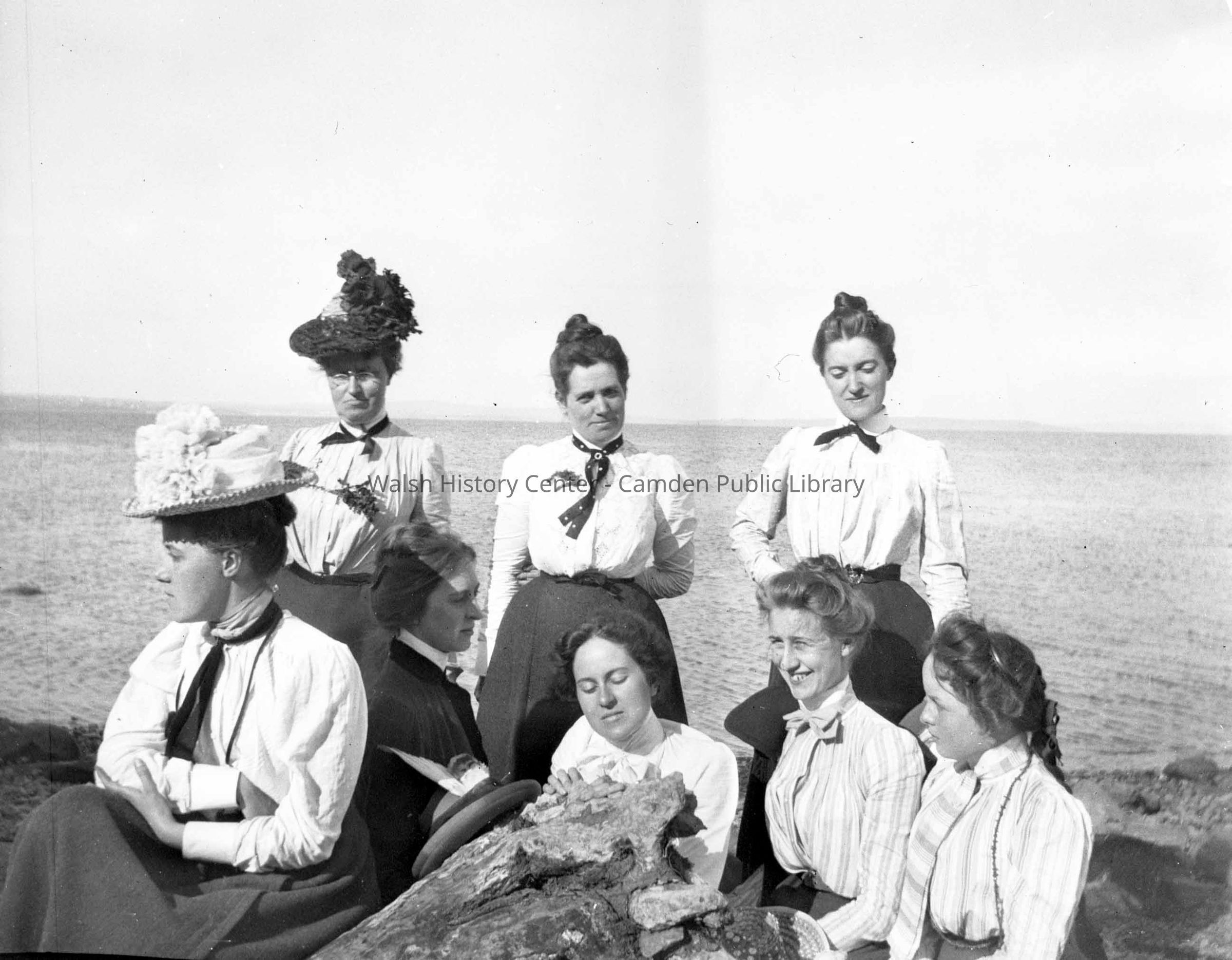 B/W photograph of Grace Parker (seated sideways at center) with friends and relatives on the beach in Northport after their buckboard ride to Belfast in August 1900.Collection