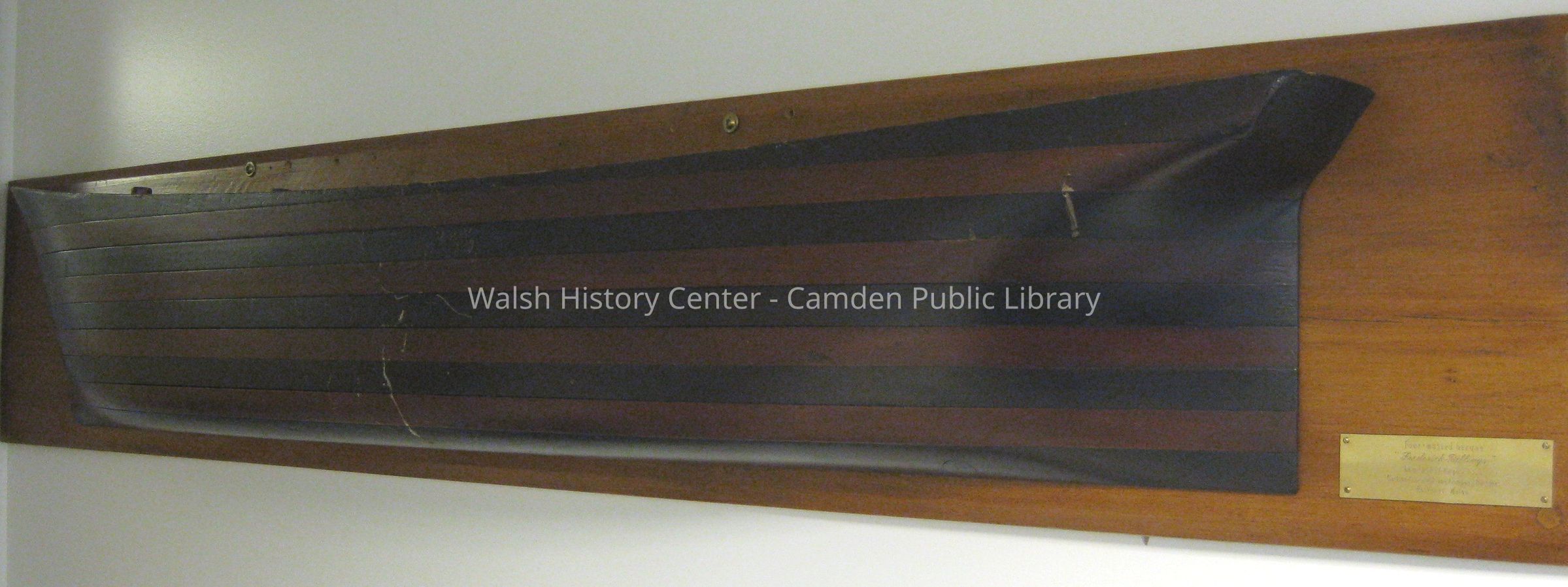 Wooden half model of the 4-masted barque "Frederick Billings." Captain Sherman, who lived at 4 Union Street, Camden, Maine owned the boat. The vessel was 2628 tons, 282 x 45 x 29 feet. Master builder was John Pascal & son. Shipmasters were Isaac W. Sherman and Herbert H. Williams. Set on fire at Pisqua, Chile, fully loaded with nitrate, the vessel exploded and sank in 20 minutes on 29 July 1893, though all crew were saved. It was said that the crew set the fires in rebellion due to harsh treatment.