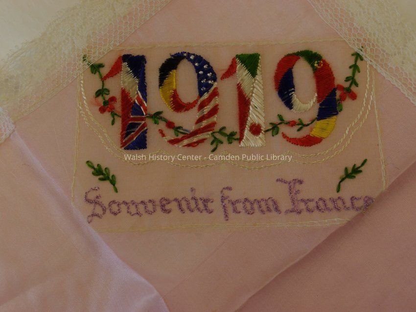 Souvenir handkerchief made in France after World War I. Bright pink with lace edging, the handkerchief has the words "Souvenir from France" embroidered in one corner. The year "1919" is also embroidered in the corner, made up of the colors of the flags of the participating countries.Collection