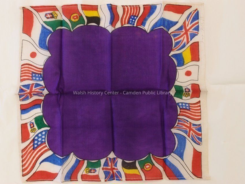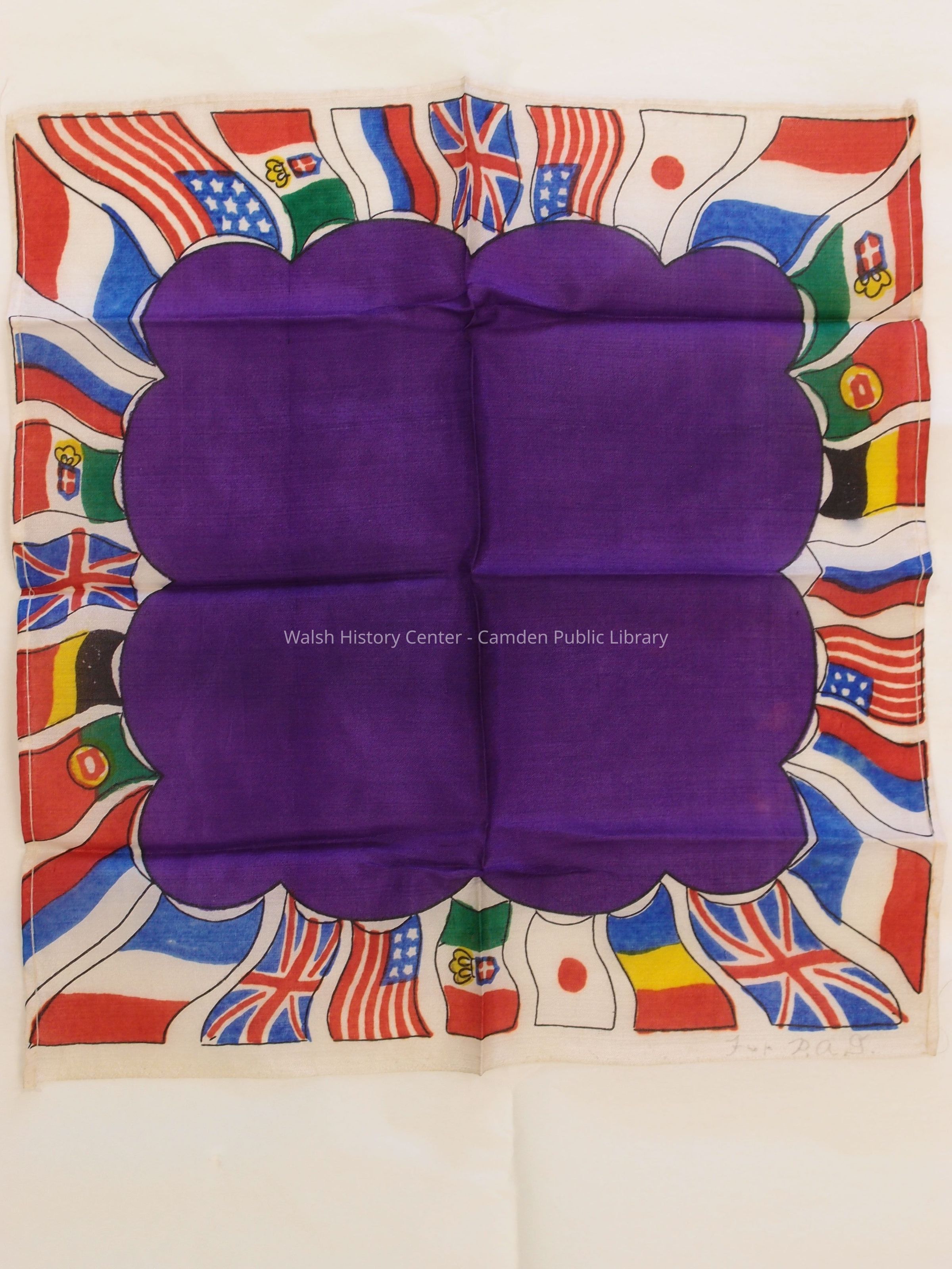 Souvenir handkerchief, purple with flags along the edges. Likely made in France around the end of World War I.Collection