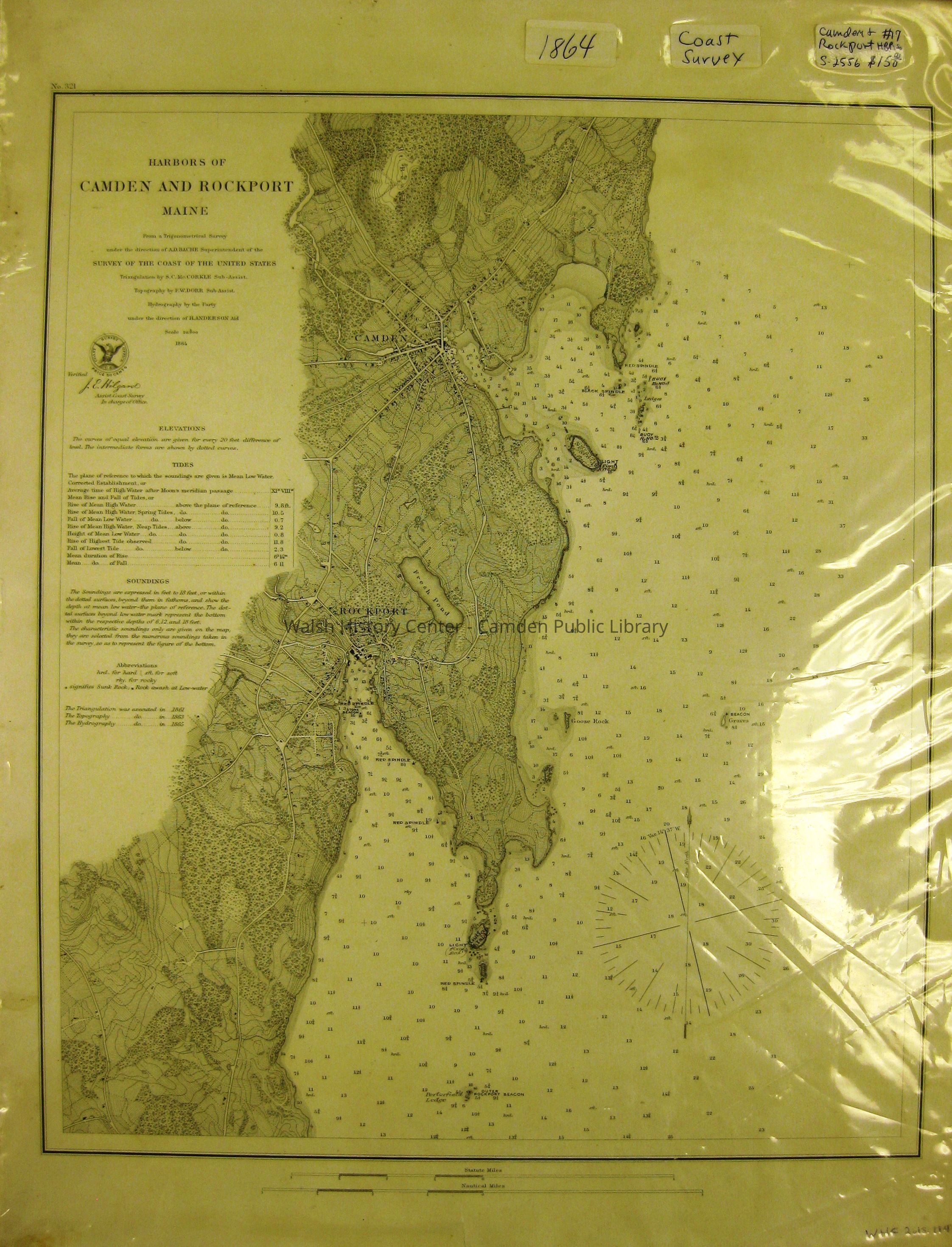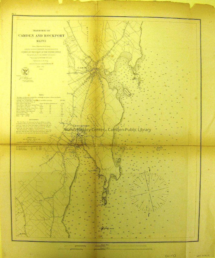 HARBORS OF CAMDEN AND ROCKPORT, MAINE. [1864/1865] from a Trigonometric Survey Under A. D. Bache, Superintendant of the Survey of the Coast of the United States. Scale 3 1/8 " to 1 Mile. Soundings are shown for the marine waters; individual buildings, roads, paths, streams, and land cover are depicted on the land area shown. Triangulation, 1861; topography, 1863; hydrography, 1865. Two copies: one copy is clear with minor tears at margins, monted on foam core board and in polyethylene protective cover. Handwritten note on protective cover: "Camden & Rockport Hbrs. #17.S-2556. $15.00. The second copy is yellowed, folded twice and stained at folds, with minor tears in the upper margin.Collection