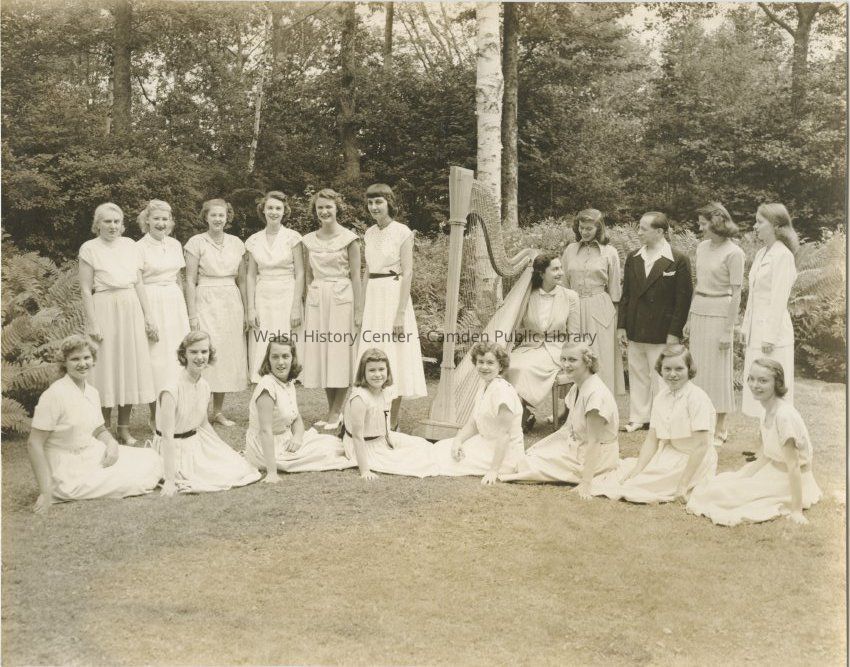 Black & white photograph of the Summer Harp Colony of America students posing with teacher and founder Carlos Salzedo in 1951.Collection