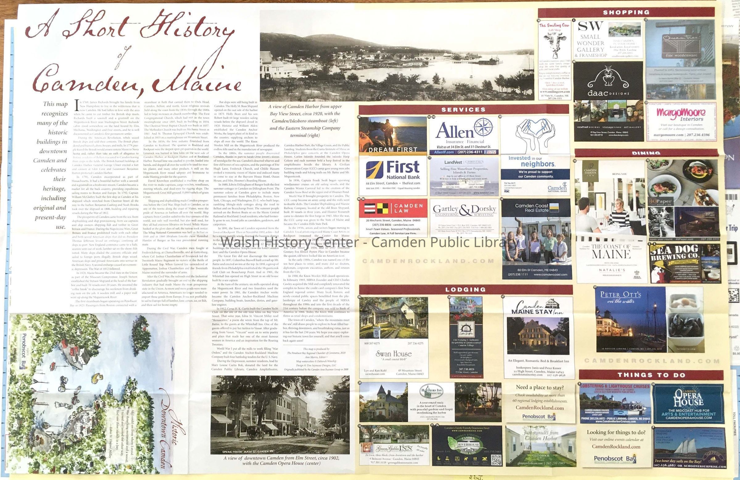Historic Downtown Camden. Penobscot Bay Regional Chamber of Commerce, 2011 (Ann Morris, Editor. Design by Tim Seymour Designs. Map watercolors by Deborah Winship. Published by the Penobscot Bay Chamber of Commerce; originated by the Camden Area Business Group in 2008). A color map depicting (in commendable detail) some 200 numbered structures along streets in the downtown area of Camden, with address and brief description of each, as well as 10 sailing vessels offering scheduled trips out of Camden Harbor.
