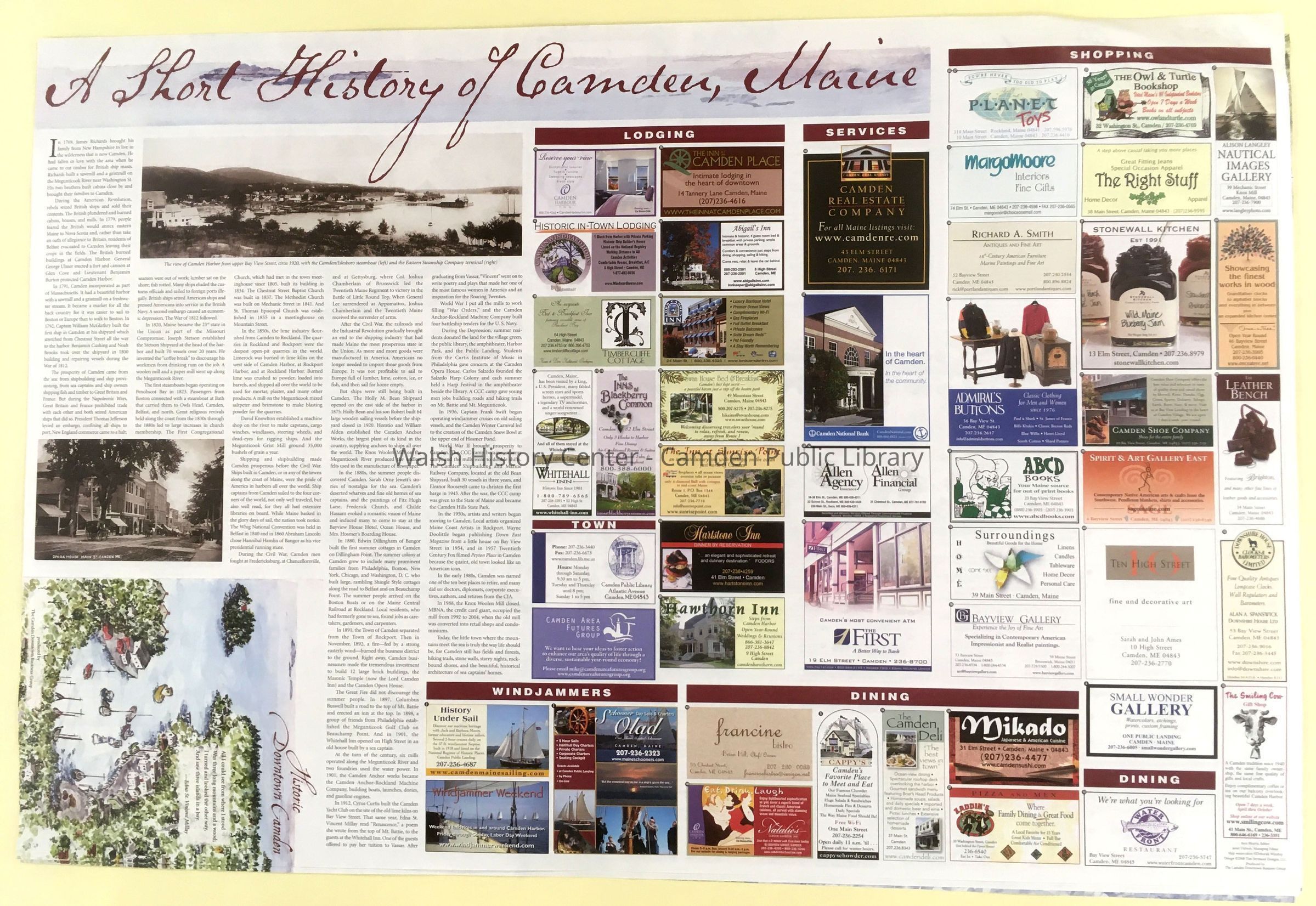 The reverse side includes "A Short History of Camden, Maine," a 1902 view of Camden from Elm Street, and a ca. 1920 panoramic view of Camden Harbor from upper Bayview Street, and sponsoring businesses categorized as Services, Lodging, Shopping, Dining, and Things To Do.Collection