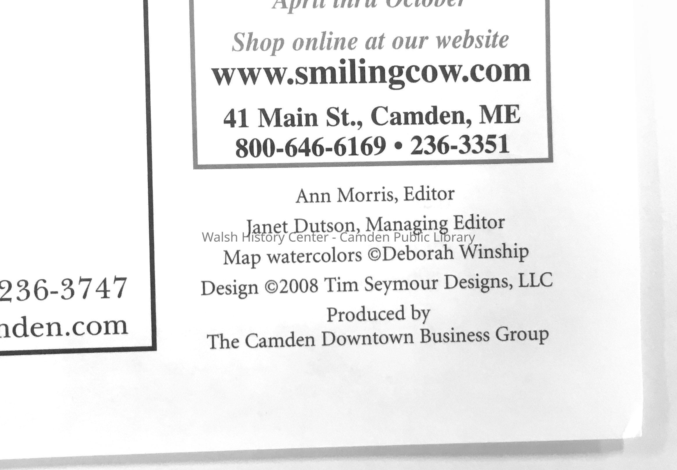 Historic Downtown Camden. Penobscot Bay Regional Chamber of Commerce, 2008 (Ann Morris, Editor. Design by Tim Seymour Designs. Produced by The Camden Downtown Business Group). A color map depicting (in commendable detail) some 200 numbered structures along streets in the downtown area of Camden, with address and brief description of each, as well as 10 sailing vessels offering scheduled trips out of Camden Harbor. Two copies.