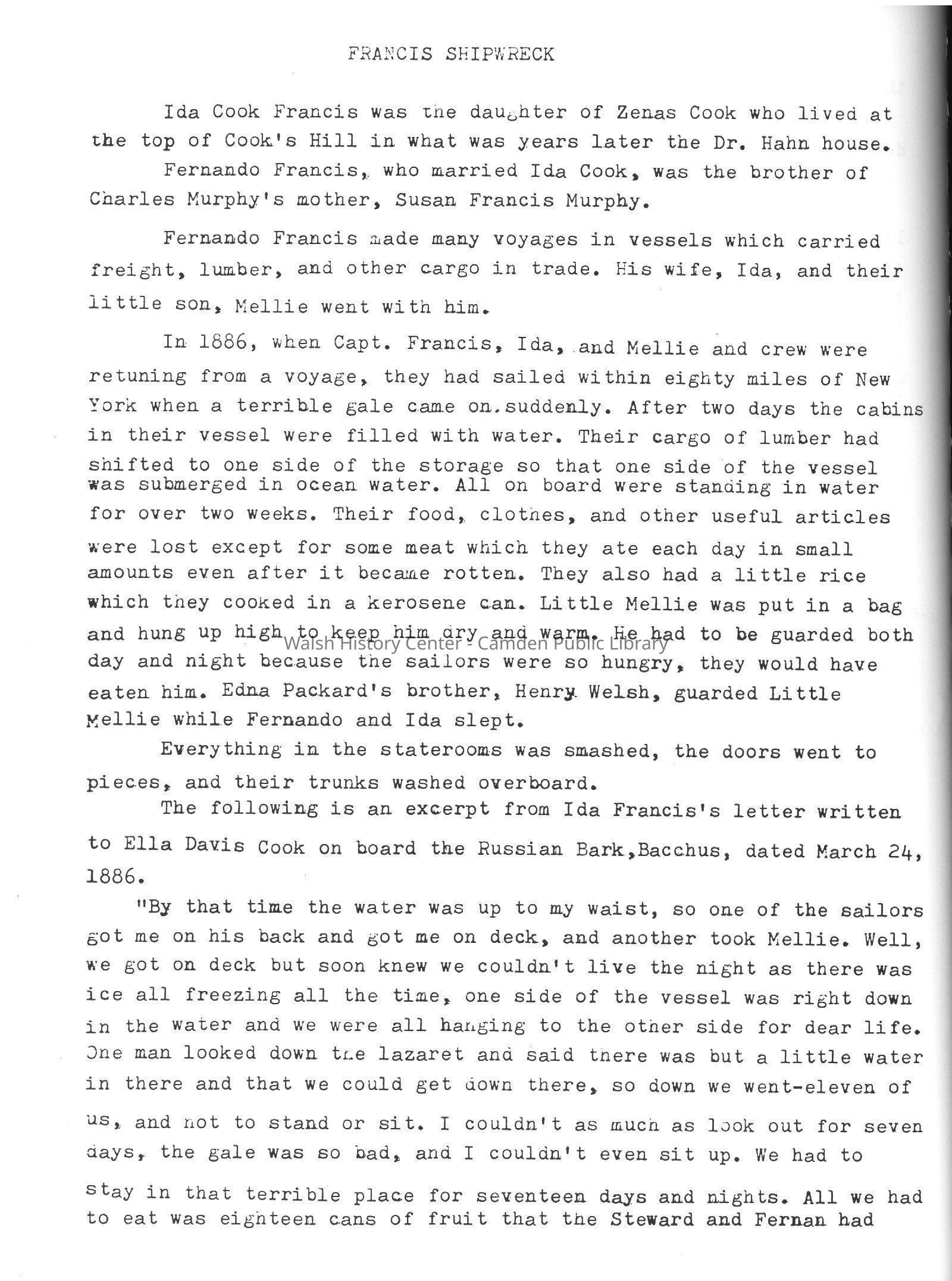 A history of the town of Friendship, Maine compiled from the notebooks of Dr. William Hahn. Includes postmasters, schools, vessels built at Morse Boat Shop, churches, noted citizens, family genealogies, family homes, those serving during war time, and an accounting of surviving a shipwreck at sea.