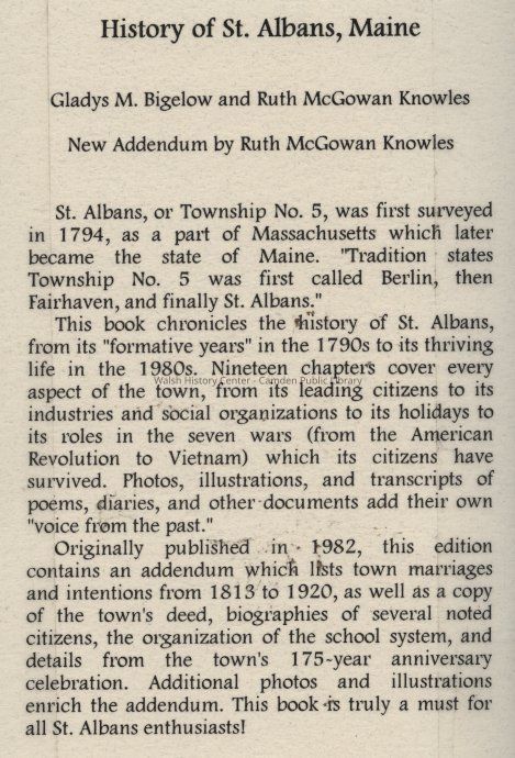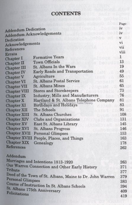 A detailed history of St. Albans from early settlement to the mid-1900's. Included are the deed of the town to Dr. John Warren, genealogical references, activities and highlights of the 175th anniversary celebration, a civil war diary, and an outline of the course of instruction for the schools of 1894.
