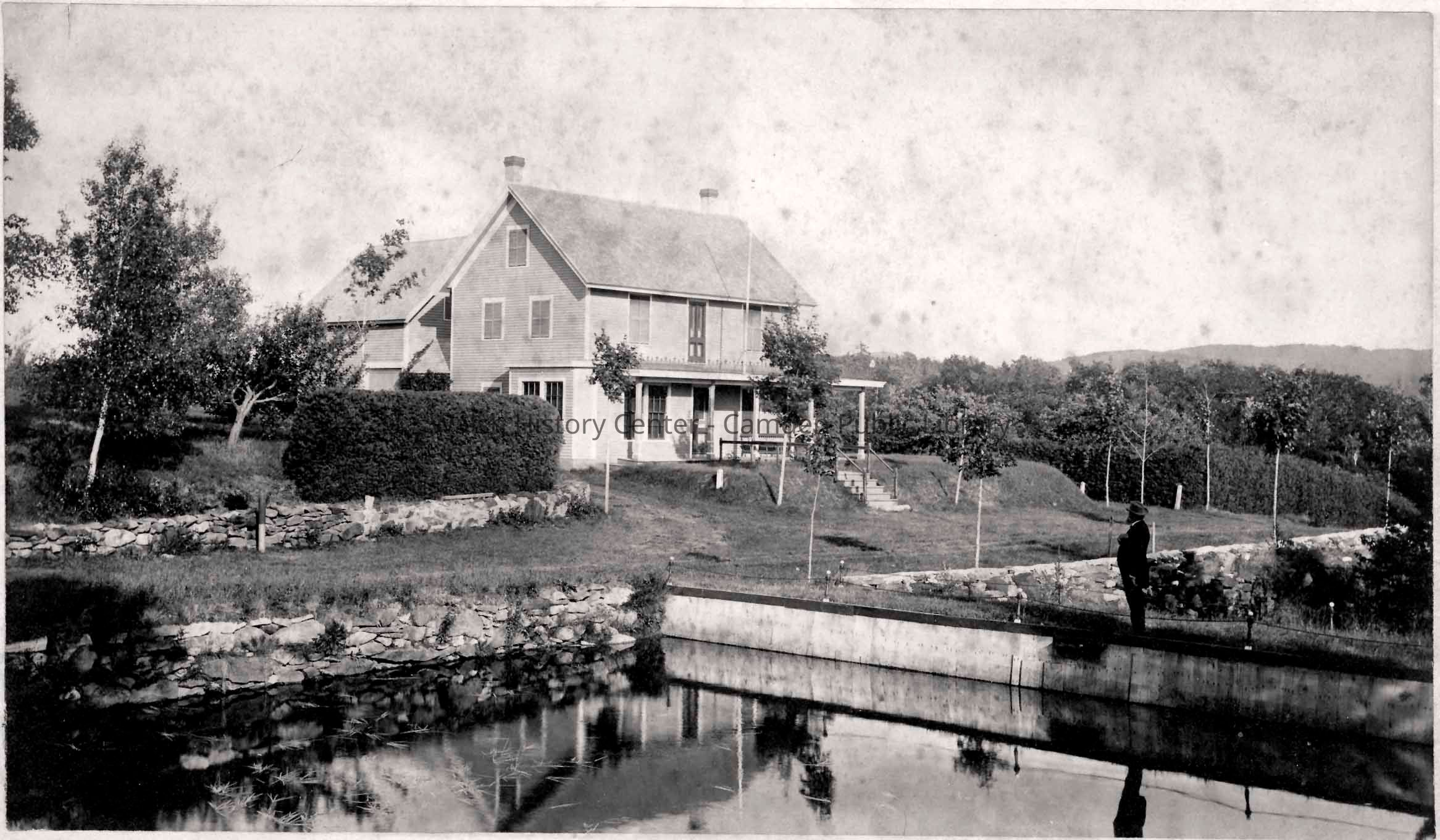 Original photograph of home with what appears to be a canal and dam in front. A man is standing on the footpath across the dam looking at the house. Inscription on back says "Josh Adams." Research in Robinson's History of Camden & Rockport shows a Joshua Adams listed as one of 3 assessors for the Camden Village Corporation in 1883.Collection