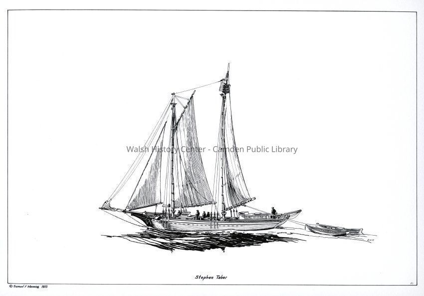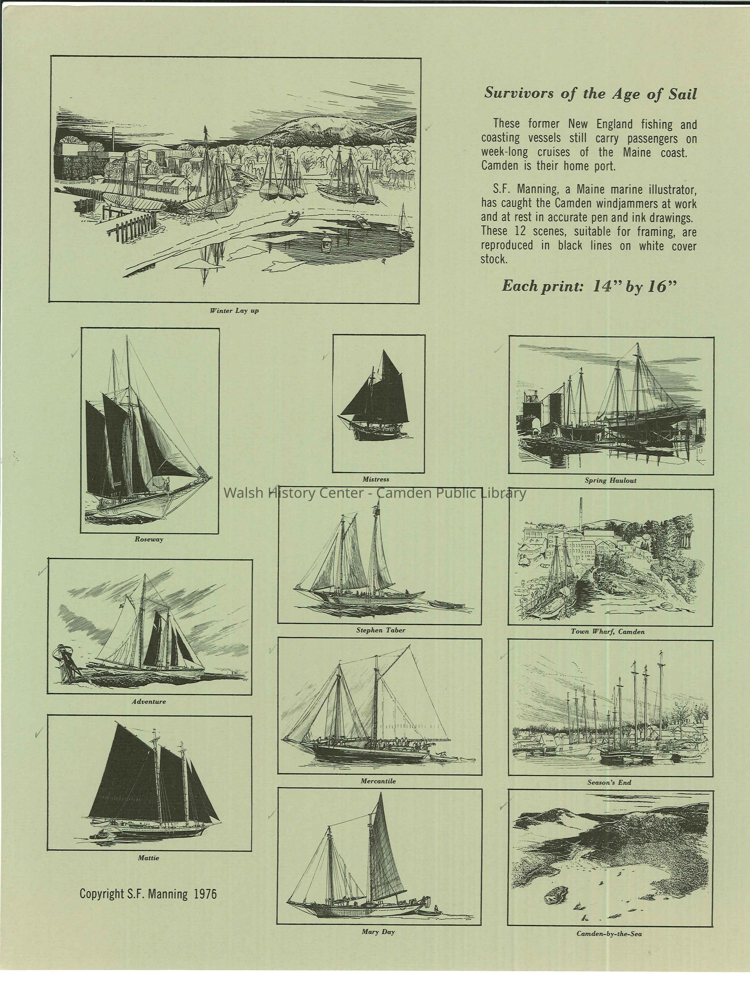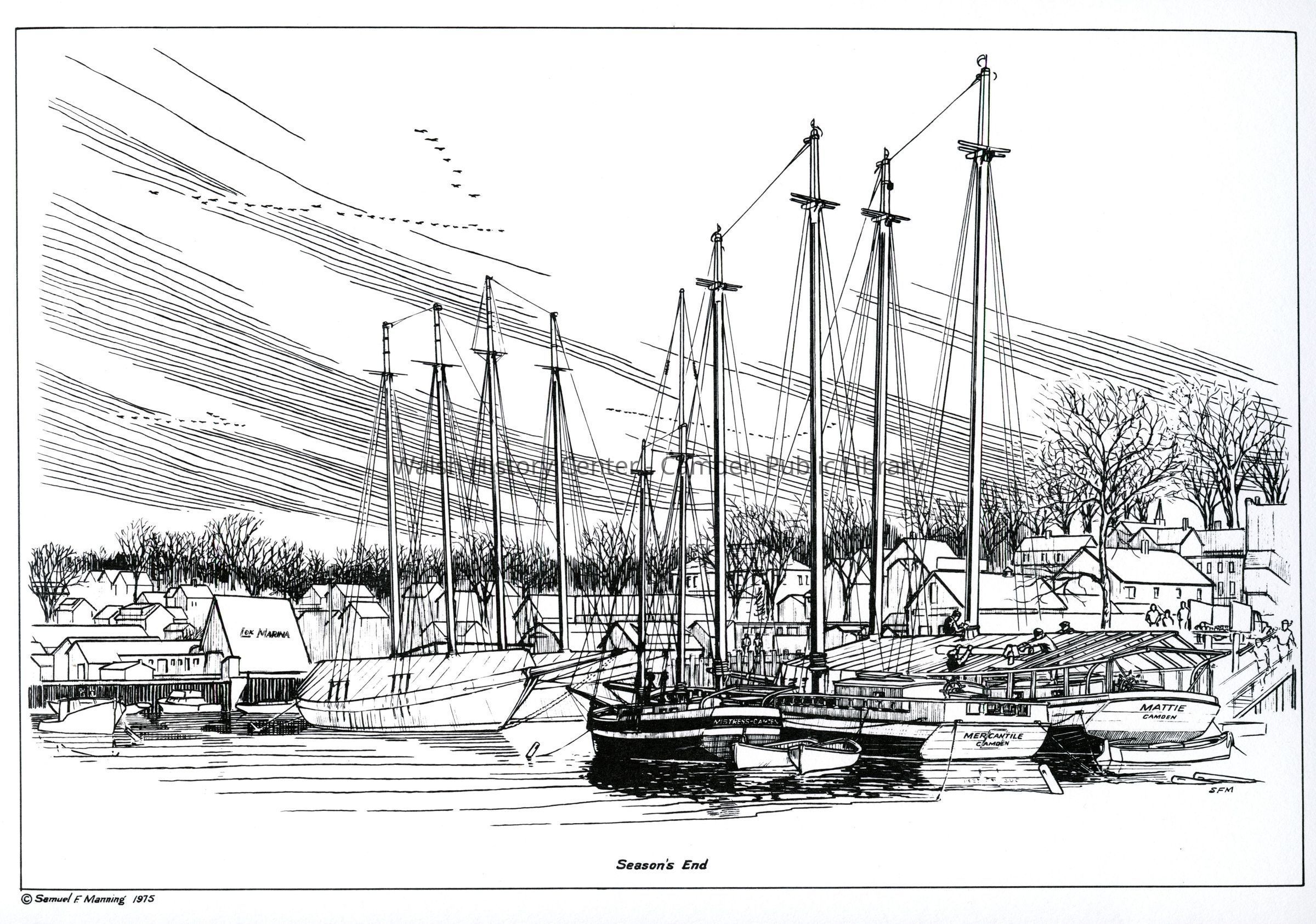 Complete set of 12 pen and ink drawings of the working schooners of the Maine coast by marine illustrator Samuel F. Manning titled "Home port, Camden, Maine." Each print is 14x16" on white cover stock.Collection