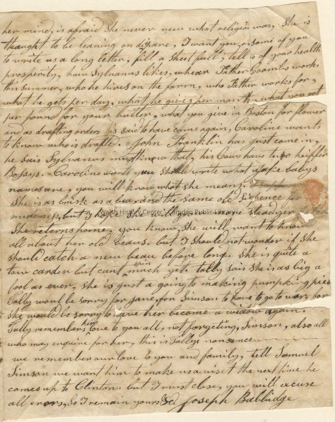 Correspondence from Joseph Babbidge to parent Sylvanus Coombs of Camden.