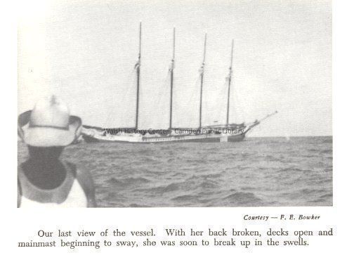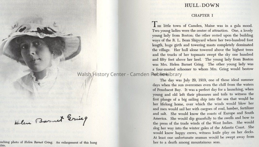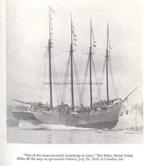 An accounting and diary of historical perspective and detail of the final voyages of the schooner, "Helen Barnet Gring", launched in Camden on July 29, 1919. She was christened with a huge bunch of red roses, the shattering of a bottle of Poland Spring water against the bow, and the release of two white pigeons. Photographs of the vessel under contruction, on launching day and subsequent voyages are included.
