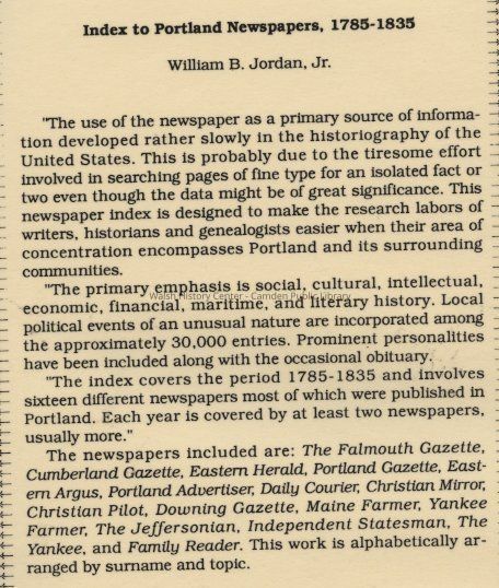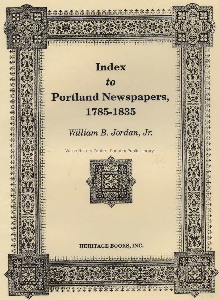A researcher's aid with primary emphasis on social, cultural, intellectual, economic, financial, maritime and literary history. The index covers the period 1785-1835 and involves sixteen different newspapers most of which were published in Portland.