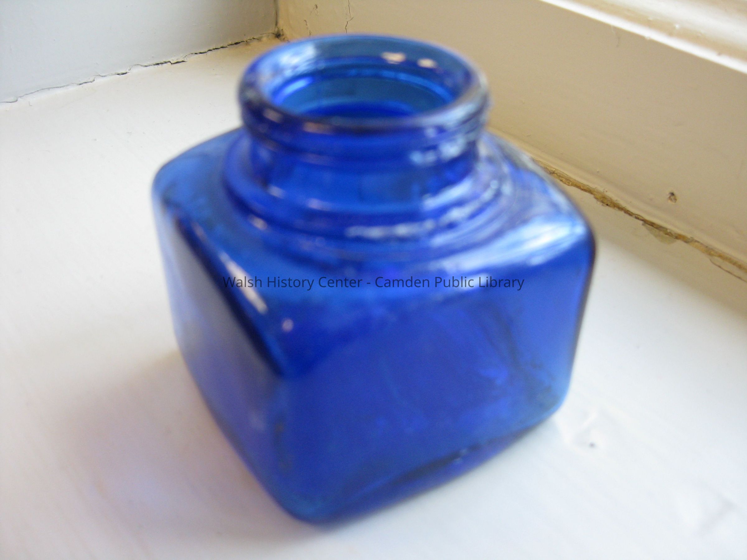 Cobalt inkwell excavated from the site of the kitchen area of the Ocean House during the construction of the underground library wing in 1996. The building was built by Captain John Pendleton in 1810 and later was enlarged and became the Ocean House hotel in 1863 and was owned by Israel Decrow. The hotel burned in 1903. Artifacts recovered by archaeologist Harbour Mitchell of Camden.Collection