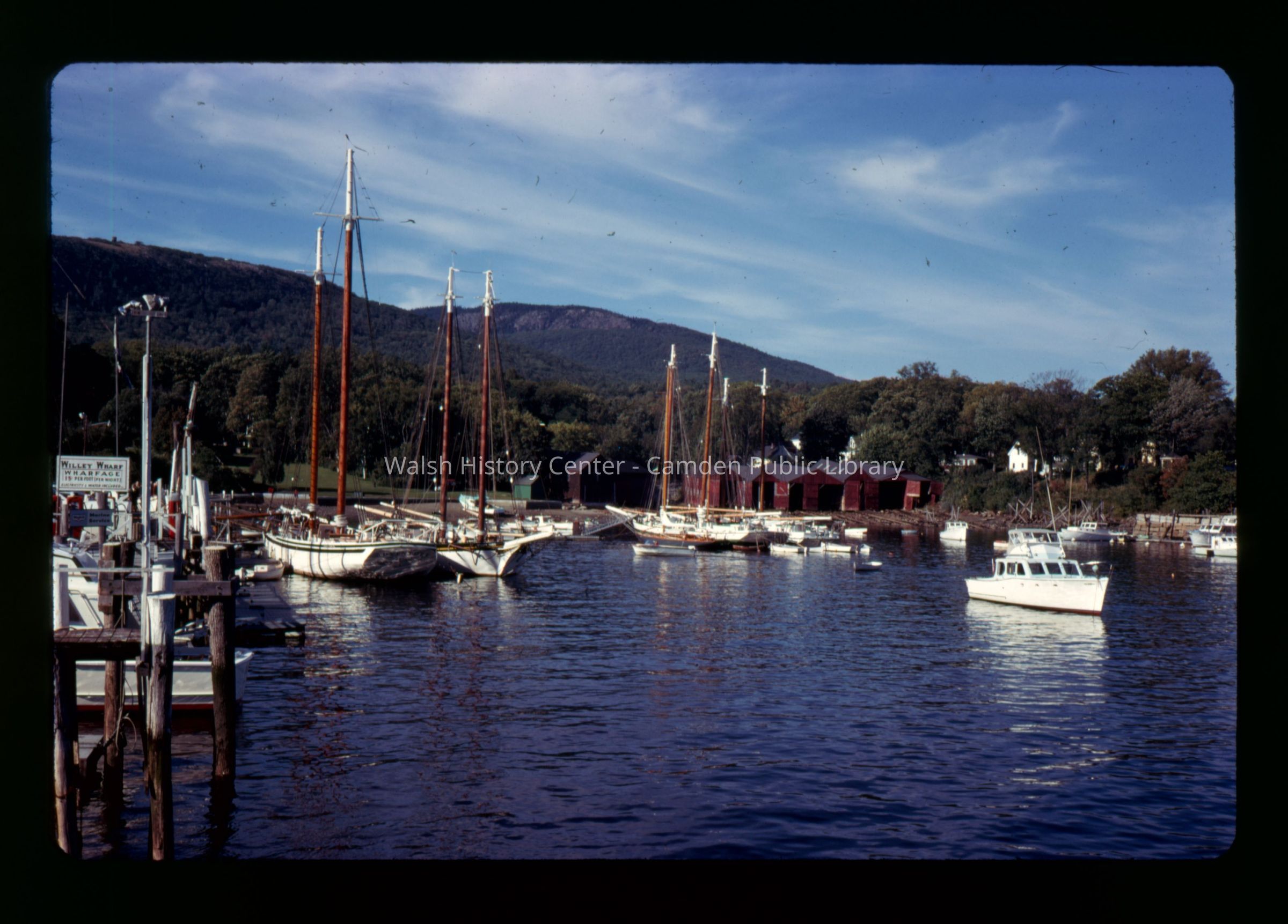 Color slide of Camden's inner harbor and red boatbuilding sheds in 1969 as viewed from the Willey wharf.Collection