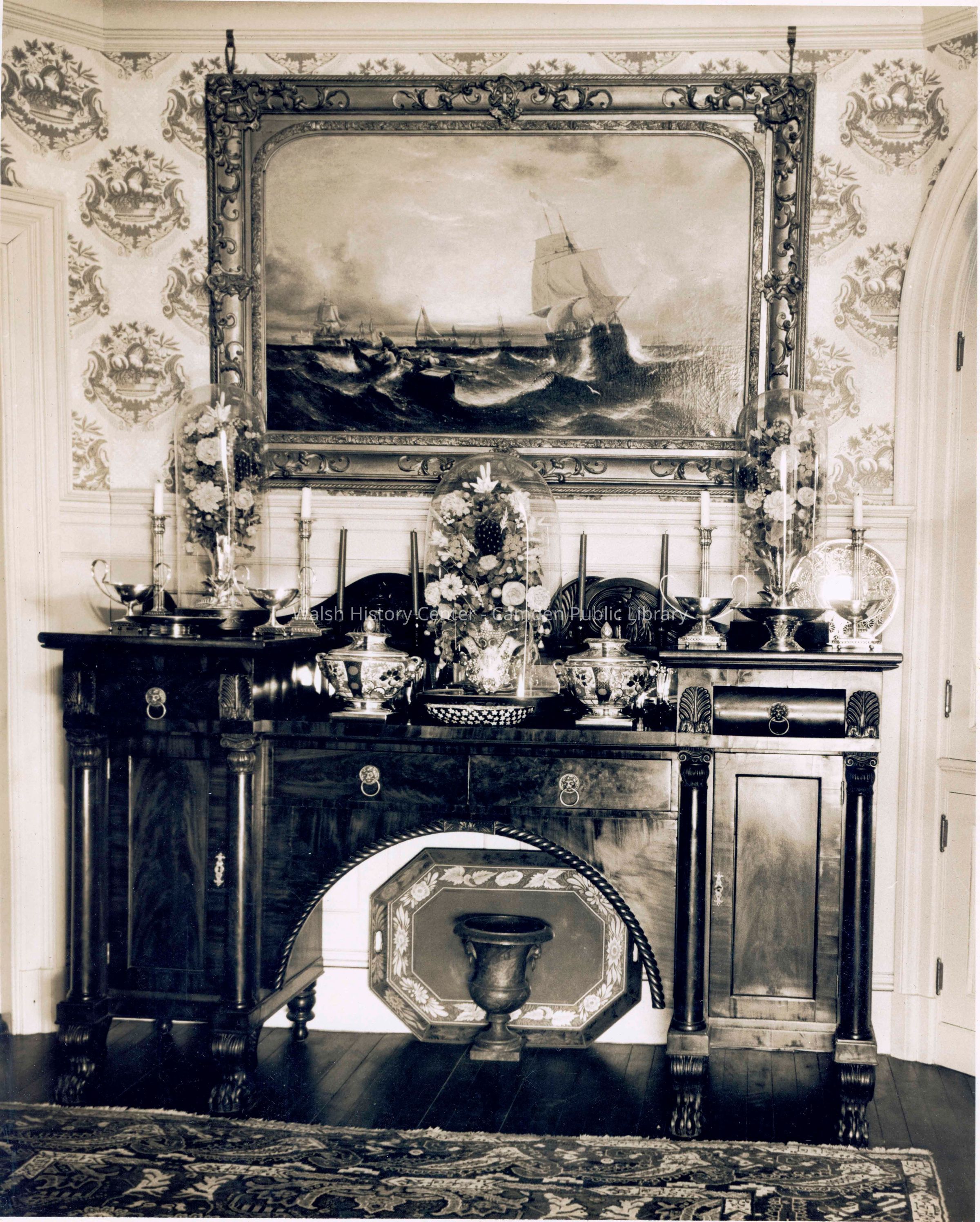 Scanned copy of photogragh from "Hill Acres" estate album. Original album owned by Lyn Woods, Camden, ME. Interior of side board and painting. Stamped on back of original: