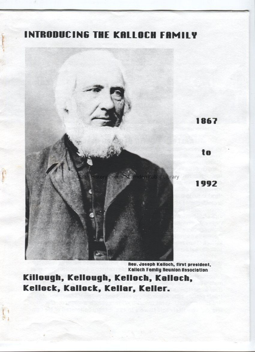 Six-page booklet on the Kalloch family genealogy 1867-1992. Includes the names Killough, Kellough, Kelloch, Kalloch, Kellock, Kallock, Kellar, and Keller. Related towns are St. George, Warren, West Rockport, and Rockland. Includes a list of resources for Kalloch genealogy researchers compiled by Peter Richardson in 1999.Collection