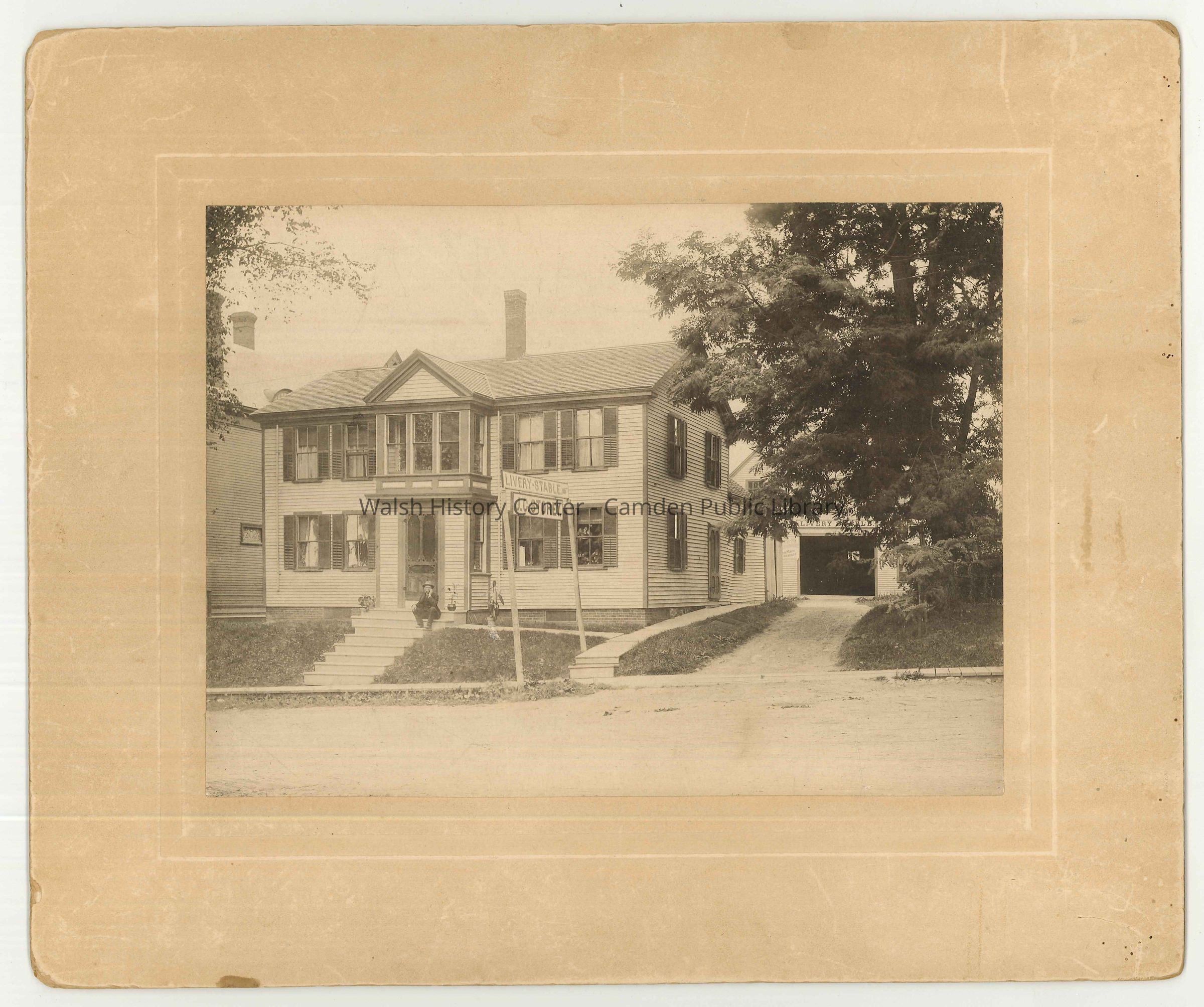 Sepia photograph of the J.C. Storey Livery Stable located in 1882 at 32 Main Street in Camden. The buildings are still standing and are directly across the street from the Camden Public Library.Collection