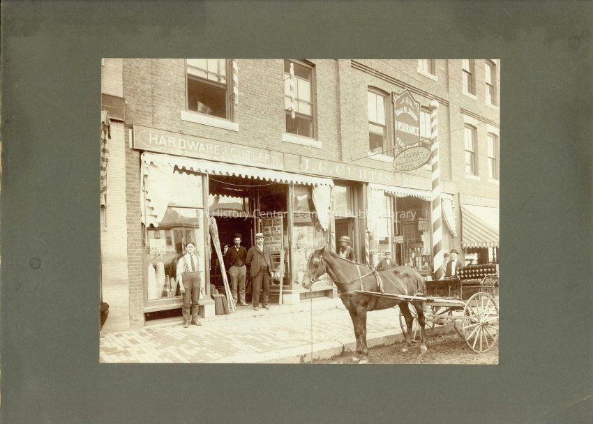 Original photograph of the J. C. Curtis Hardware store on Elm Street in Camden circa 1895. The store was established in 1838 and sold hardware, tools, paints, housewares and sporting goods. The reflection in the left window is the old harness shop across from the Village Green where the Camden Post Office is now located. Left to right: Win Bassick, Jane Bickford, J. C. Curtis, A. H. Parsons, John Ferrih, Charlie Burd, Herbert Young and "Spike" (the horse).Collection