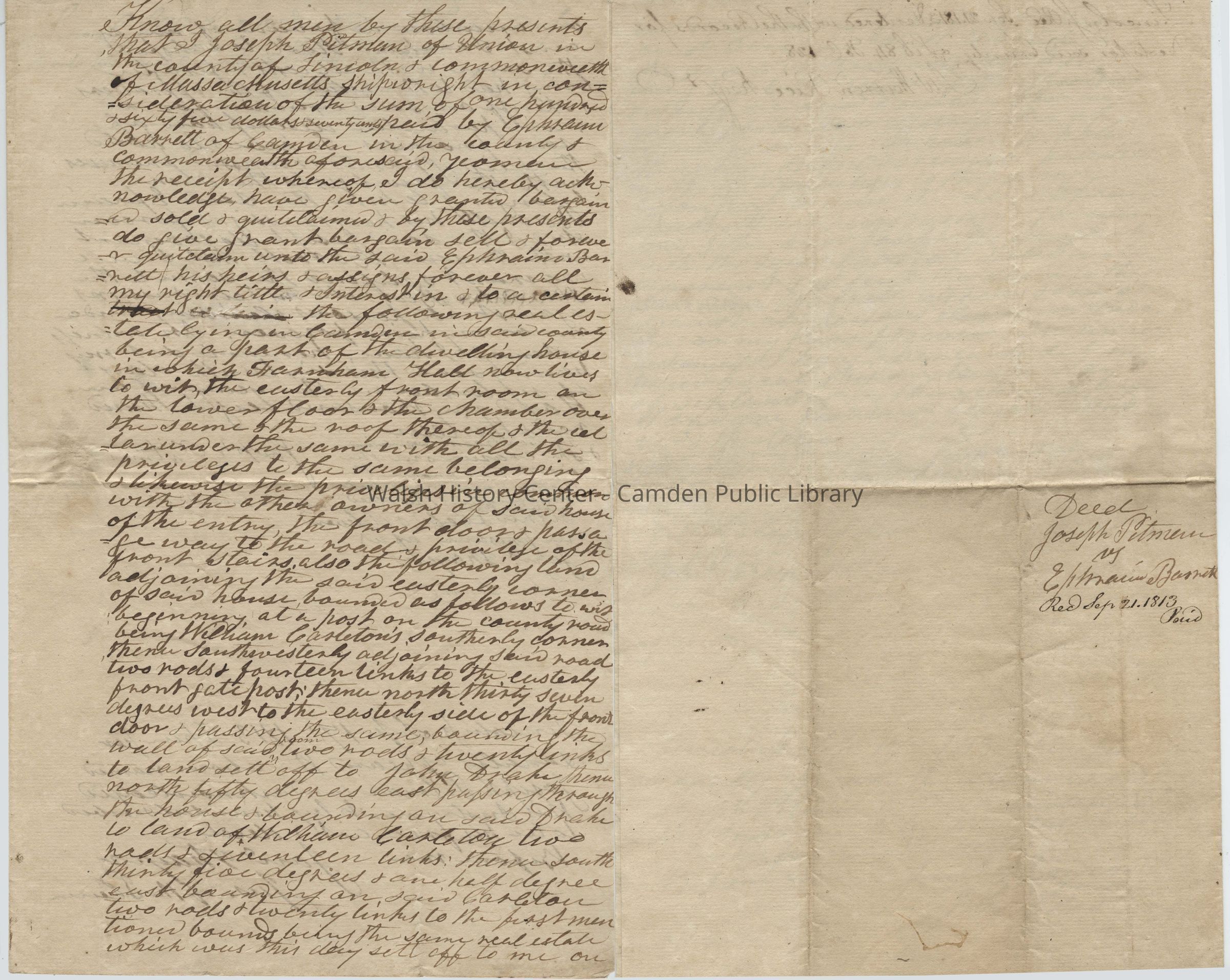 DEED FOR ONE ROOM IN THE HOUSE OF JOSEPH PITMAN, CAMDEN, MAINE SEPTEMBER 17, 1813