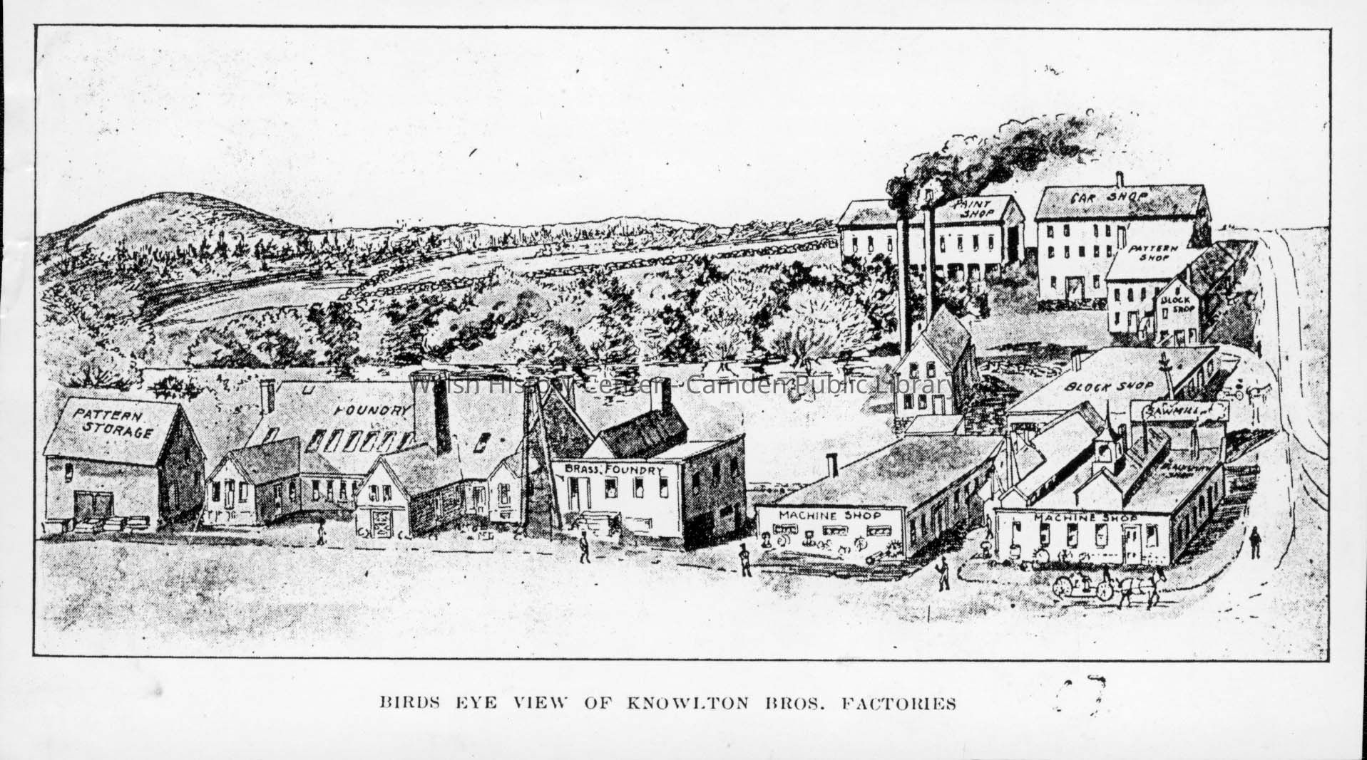 Copy of a pencil sketch copied from a magazine or book of the Knowlton Brothers Foundry with caption, "Birds Eye View of Knowlton Bros. Factories."
