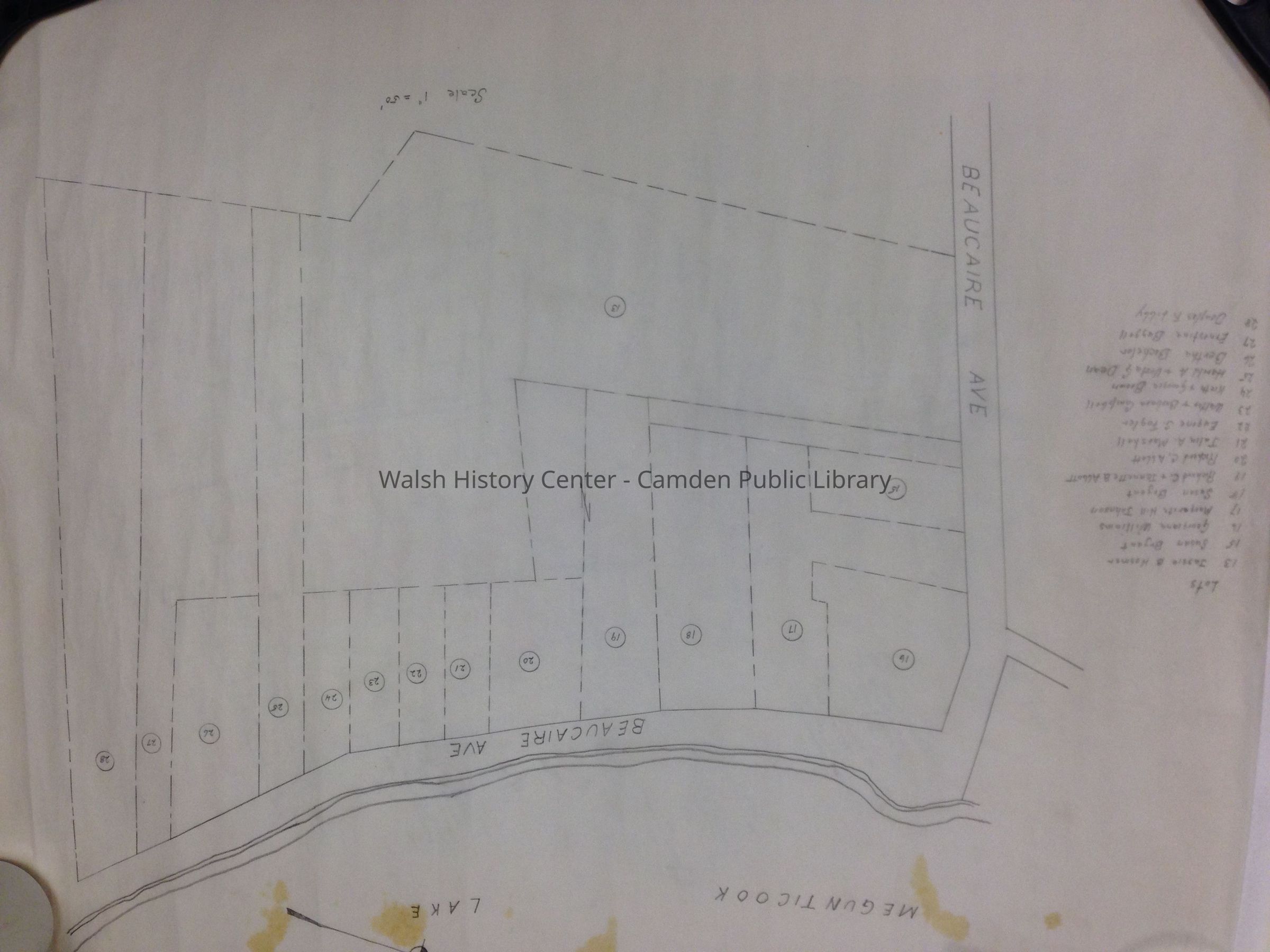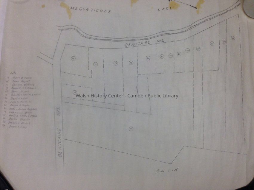 Hand-drawn map of Lake City lots bounded on two sides by Beaucaire Avenue. Map is in pencil, is undated and the creator is unknown. Shows lots 13-28 with owners Hosmer, Bryant, Williams, Johnson, Abbott, Marshall, Fogler, Campbell, Brown, Dean, Bachelor, Buzzell, and Libby.Collection