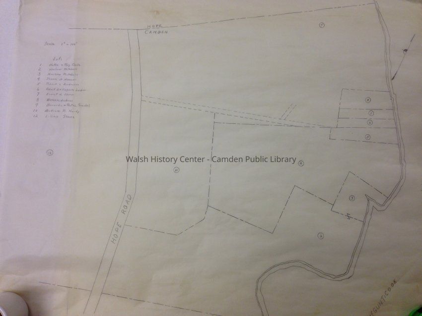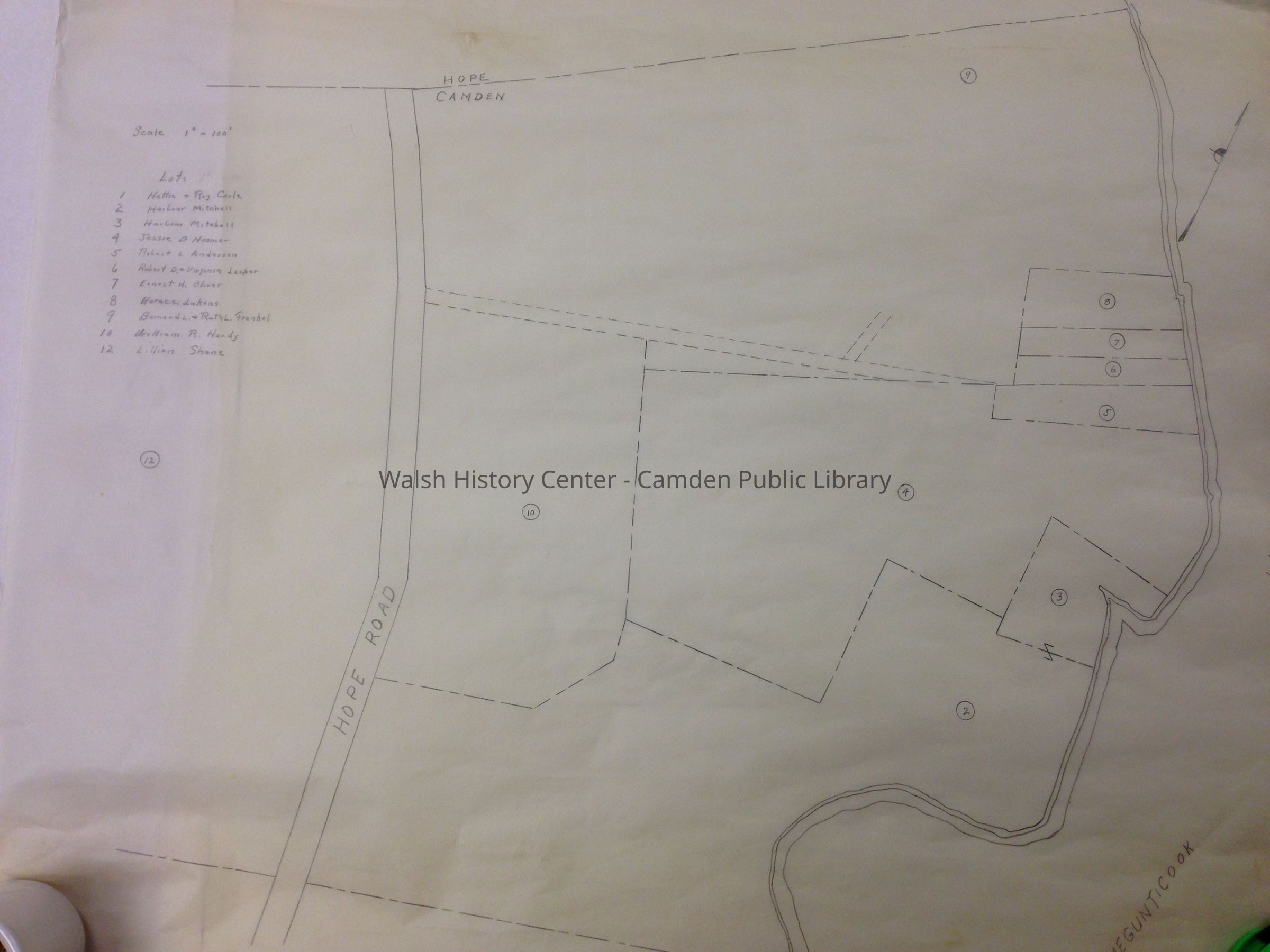 Hand-drawn map of Lake City lots bounded on two sides by Hope Road and Megunticook Lake. Map is in pencil, is undated and the creator is unknown. Shows lots 1-12 with owners Carle, Mitchell, Hosmer, Anderson, Leeper, Oliver, Lukens, Frankel, Hardy, and Shane.Collection