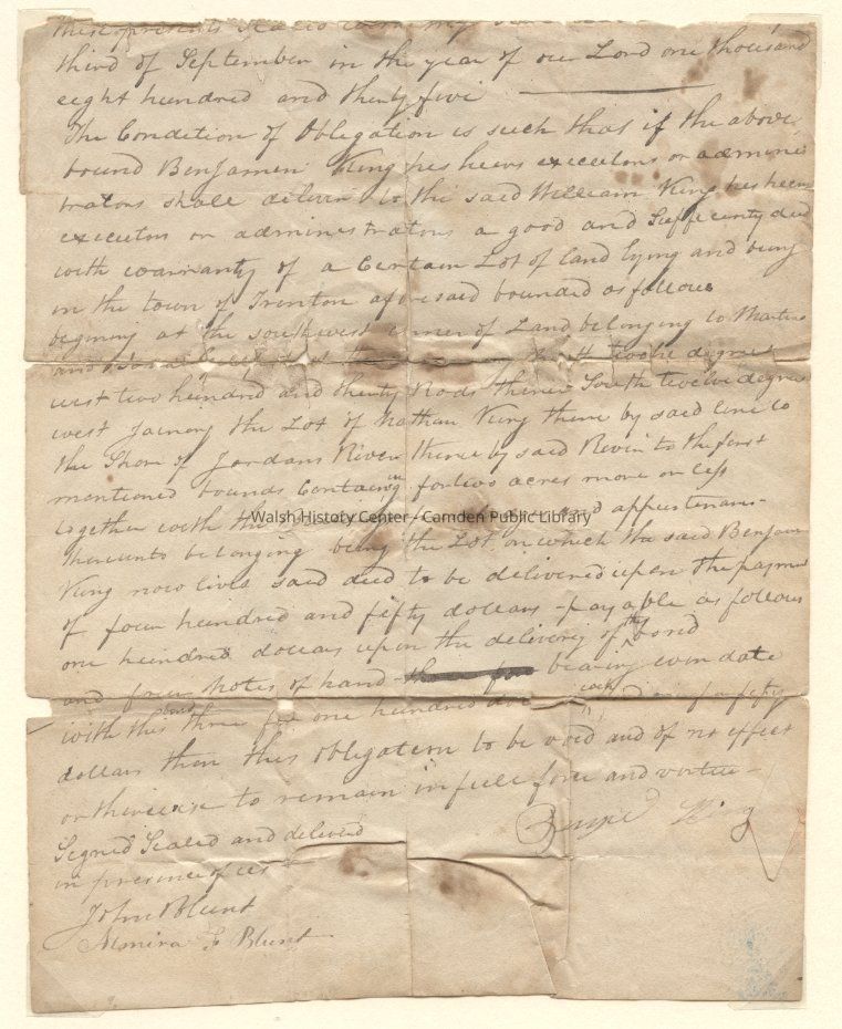 Document dated September 3, 1835 from Benjamin King to William King referencing sale of a lot of land in Trenton, Maine.Collection
