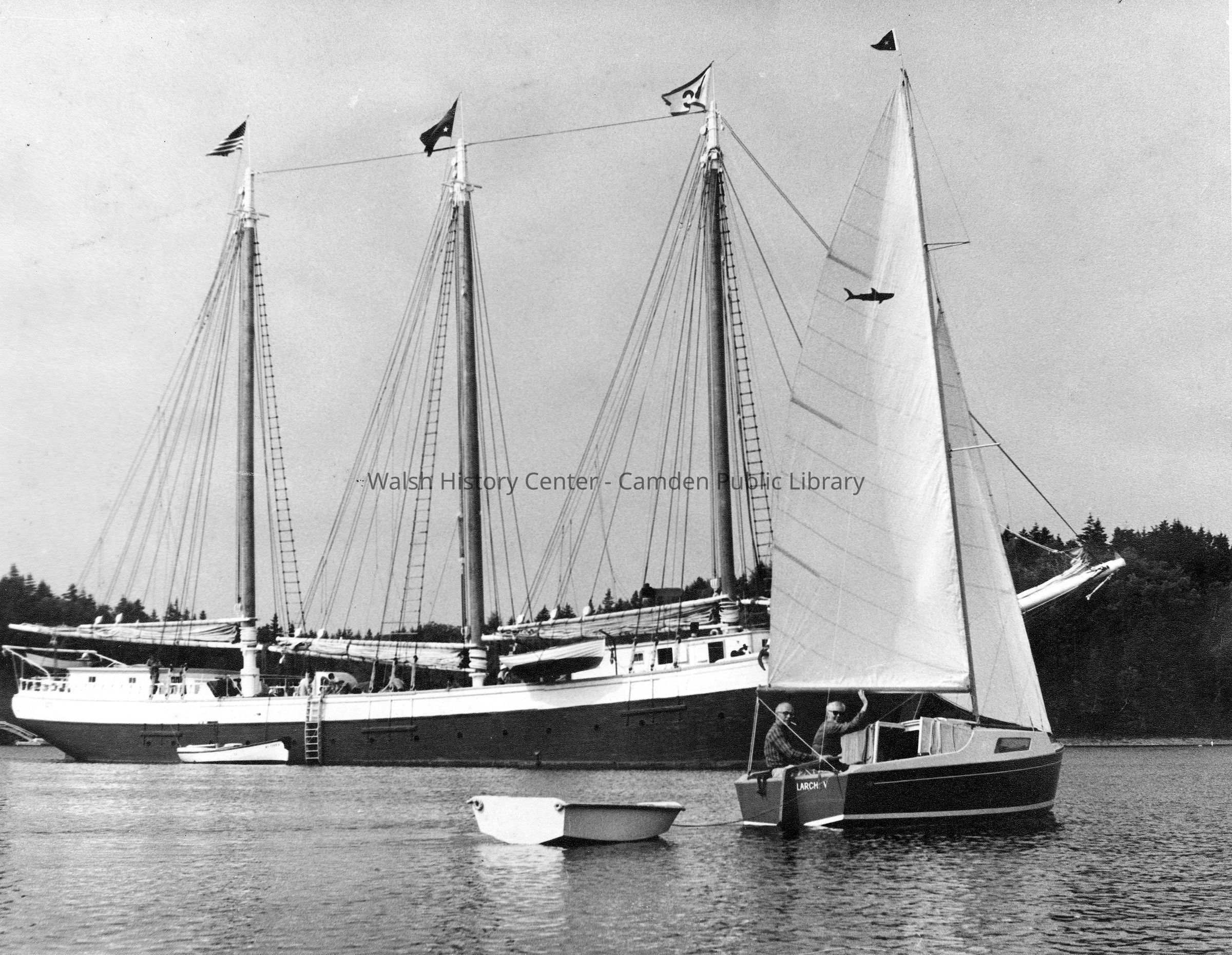 "Larch V" dwarfed by a large 3-masted schooner in Camden harbor circa 1950Collection