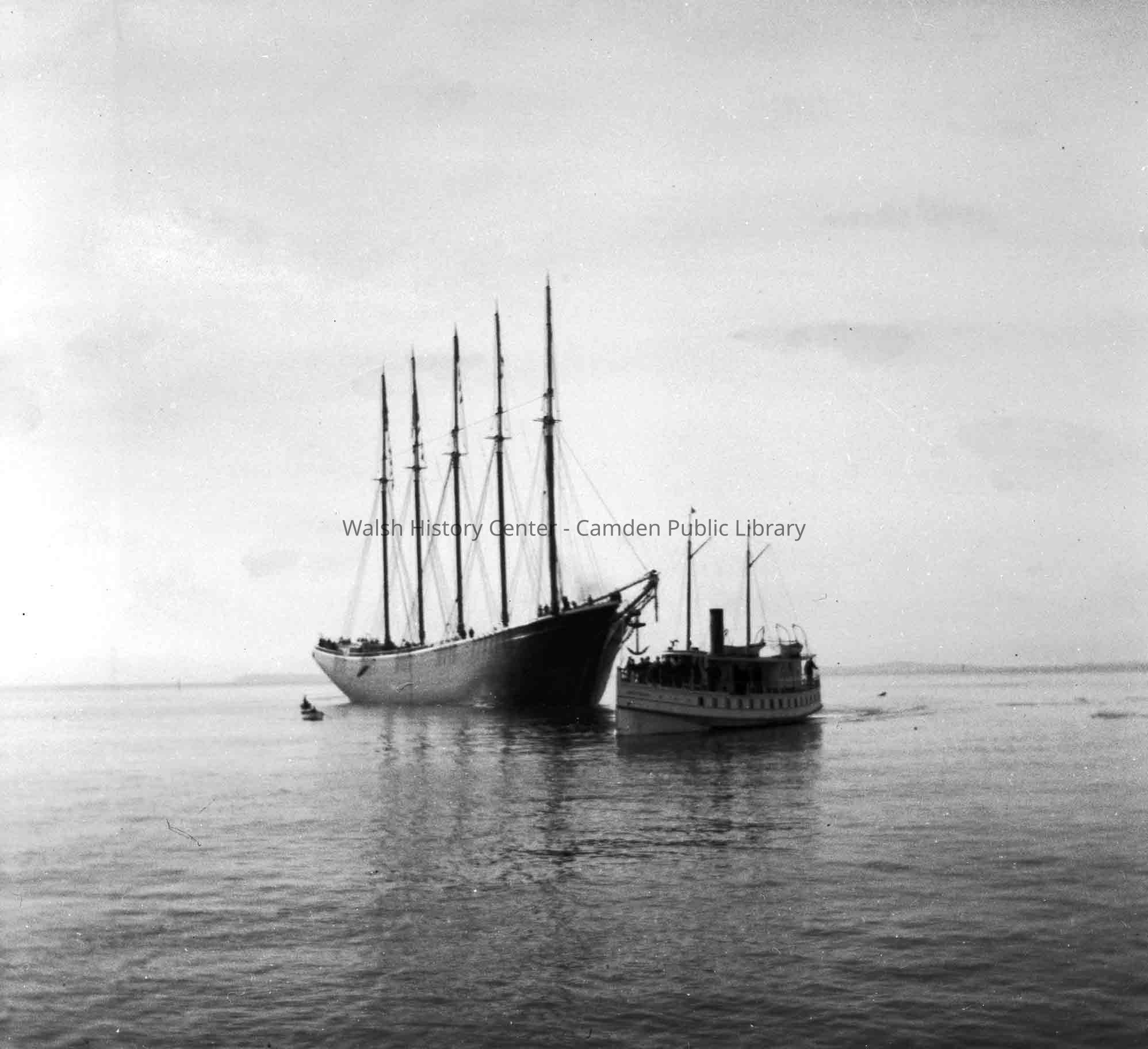 The 5-masted schooner "Jennie French Potter" was 257 feet long and was launched from the Holly M. Bean shipyard in Camden in 1899. It dwarfs the passenger steamship and skiff next to her.Collection