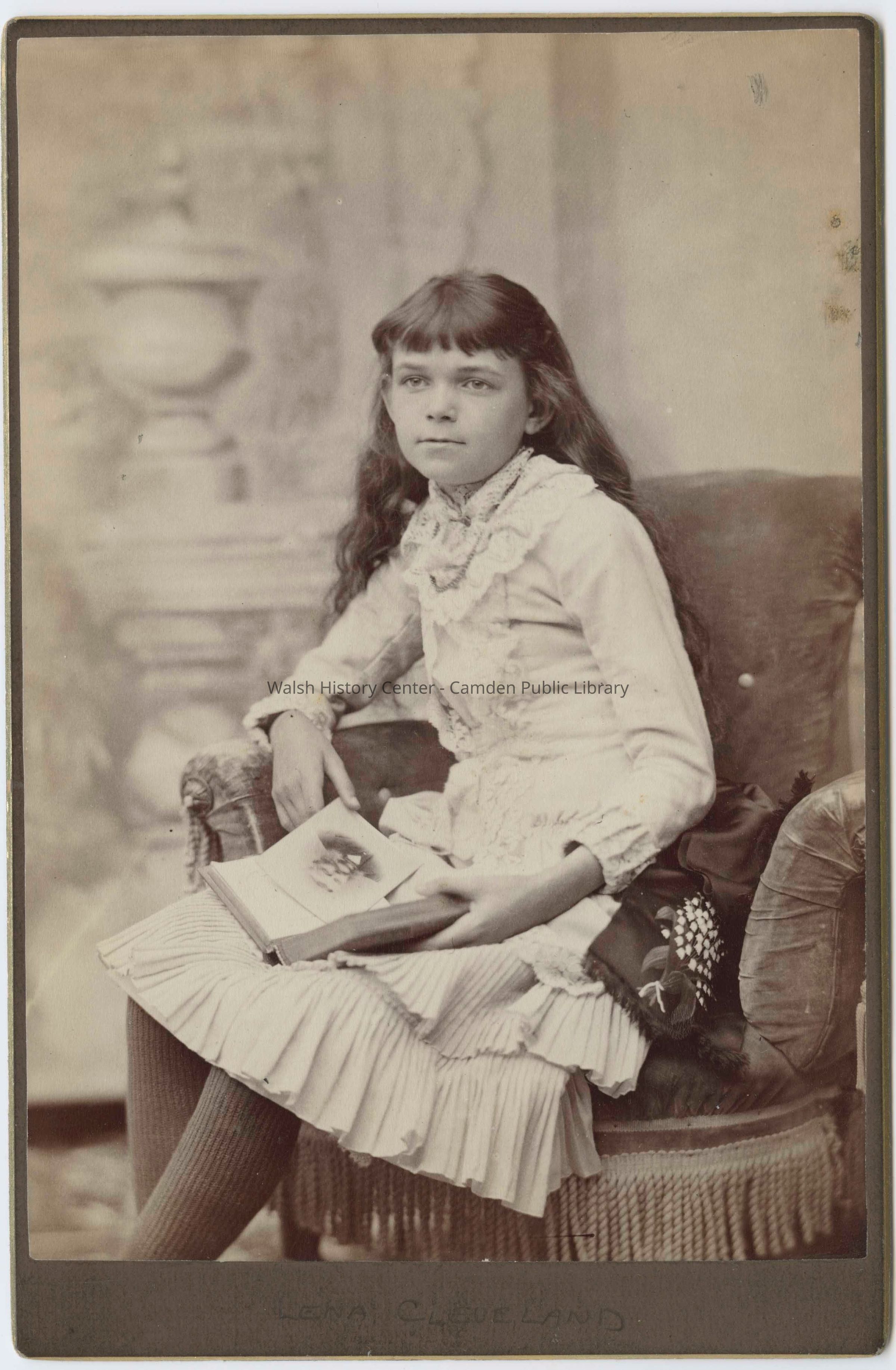 Sepia cabinet card photograph of Lena Cleveland as a young girl, likely around 1880. She is seated wearing a ruffled dress and dark knit stockings, and she is holding a photograph of an older man, perhaps her father.Collection