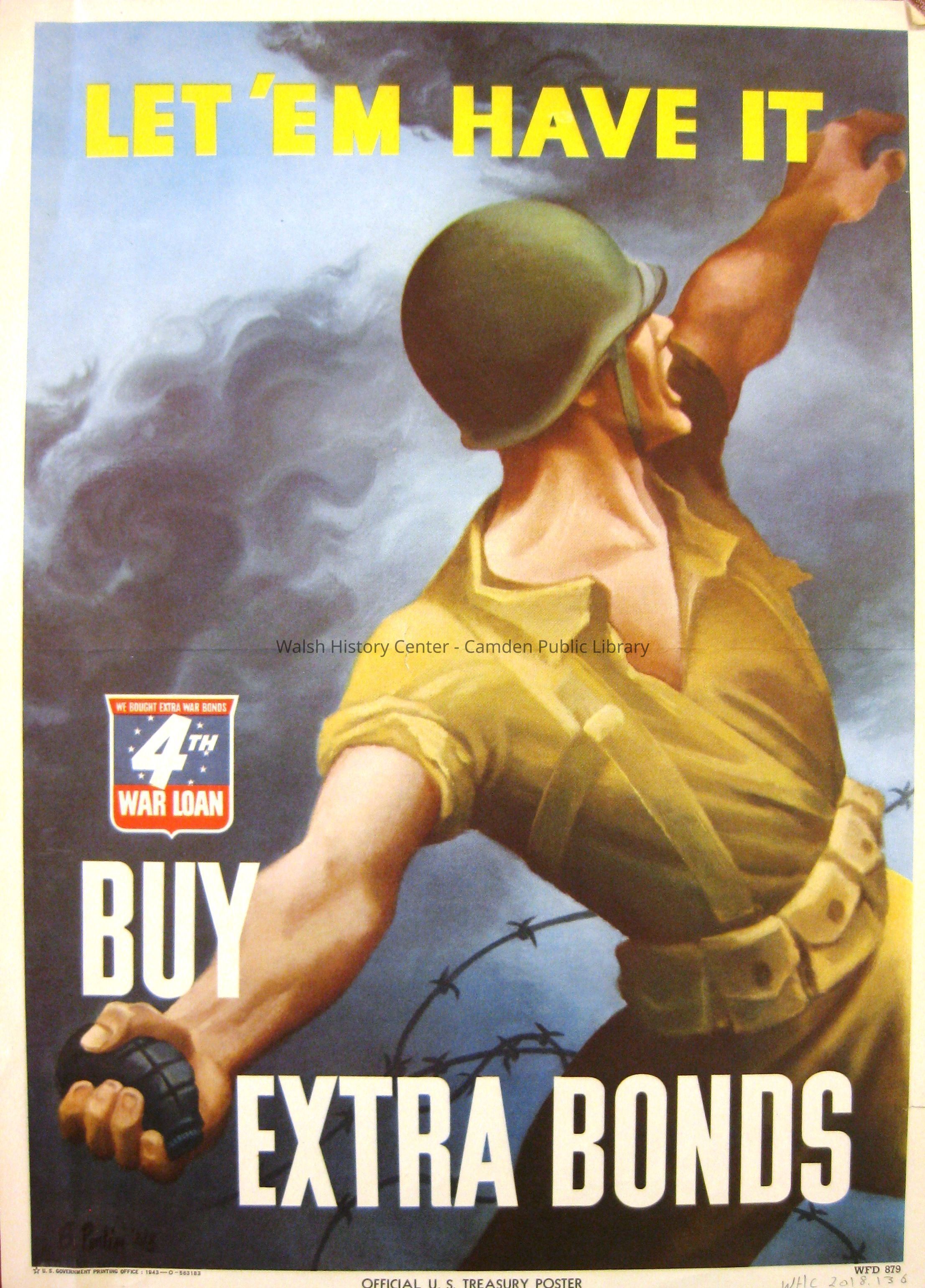 US TREASURY POSTER - WAR BONDS. US Government Printing Office No. 1943-0-563-183; WFD 879. "Let Em Have It" Soldier throwing grenade. Colour on white paper. Good condition; was folded in half.Collection