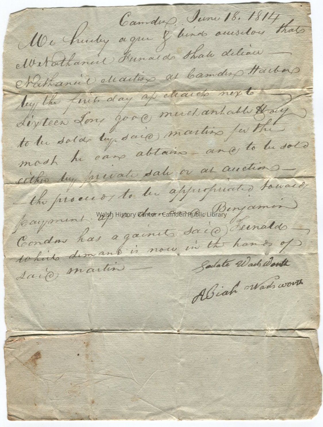 Letter of obligation for 16 tons of hay June 1814Entry/Object ID