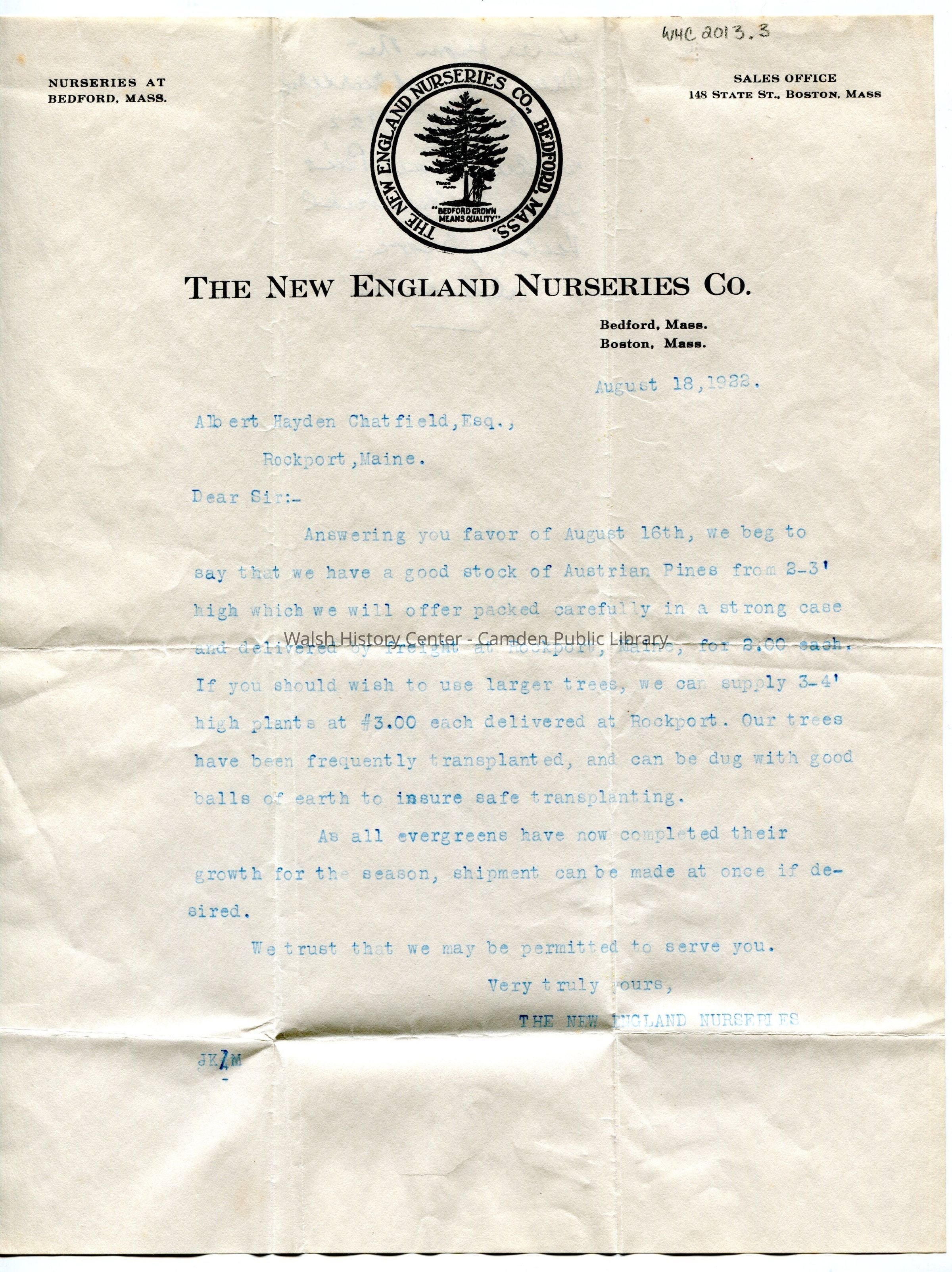 Letter to Albert H. Chatfield from New England Nurseries Company of Massachusetts regarding cost of pine trees for Victory Grove memorial at Aldermere Farm. Letter dated August 18, 1922.Collection