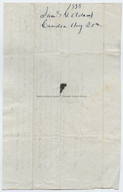 Letter to Joel Fay of Boston, Massachusetts from Samuel G. Adams of Camden, Maine dated 20 August 1838:
