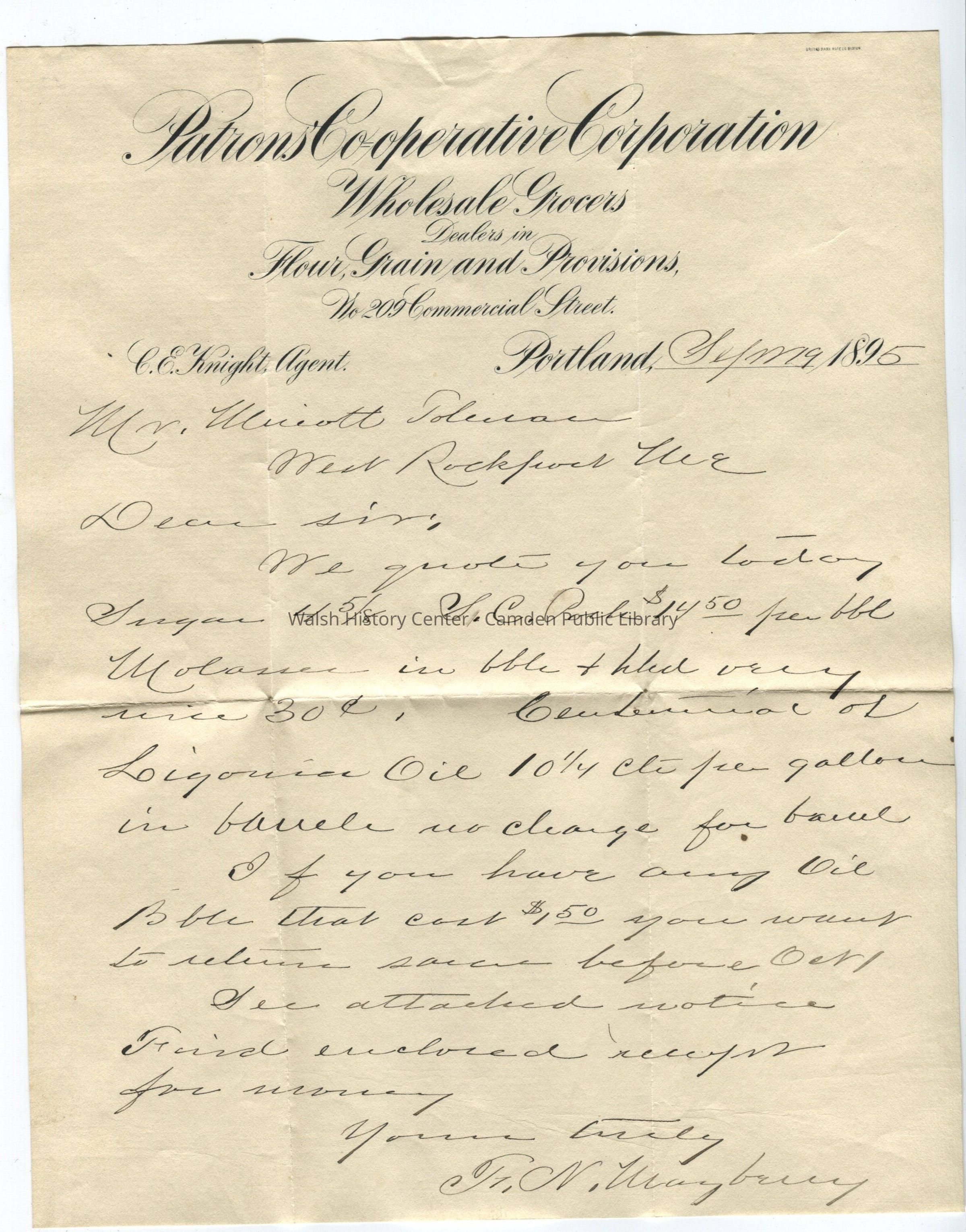 Letter from the Patron's Co-Operative Corporation in Portland, Maine, addressed to Minott Tolman in West Rockport. Dated September 19, 1895.Collection