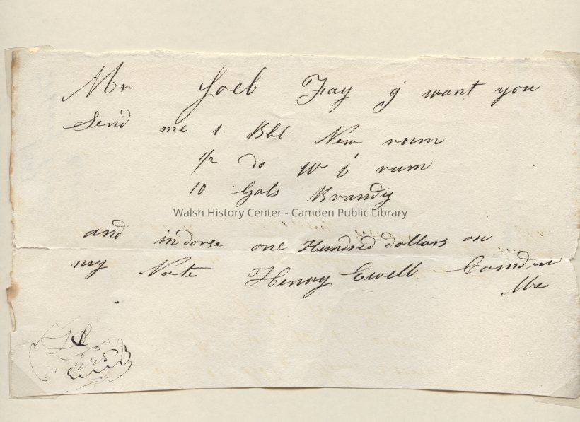 "Mr. Joel Fay i want you send me 1 Bbl New rum, 1/2 (?) W i rum, 10 Gals Brandy and indorse one Hundred Dollars on my Note